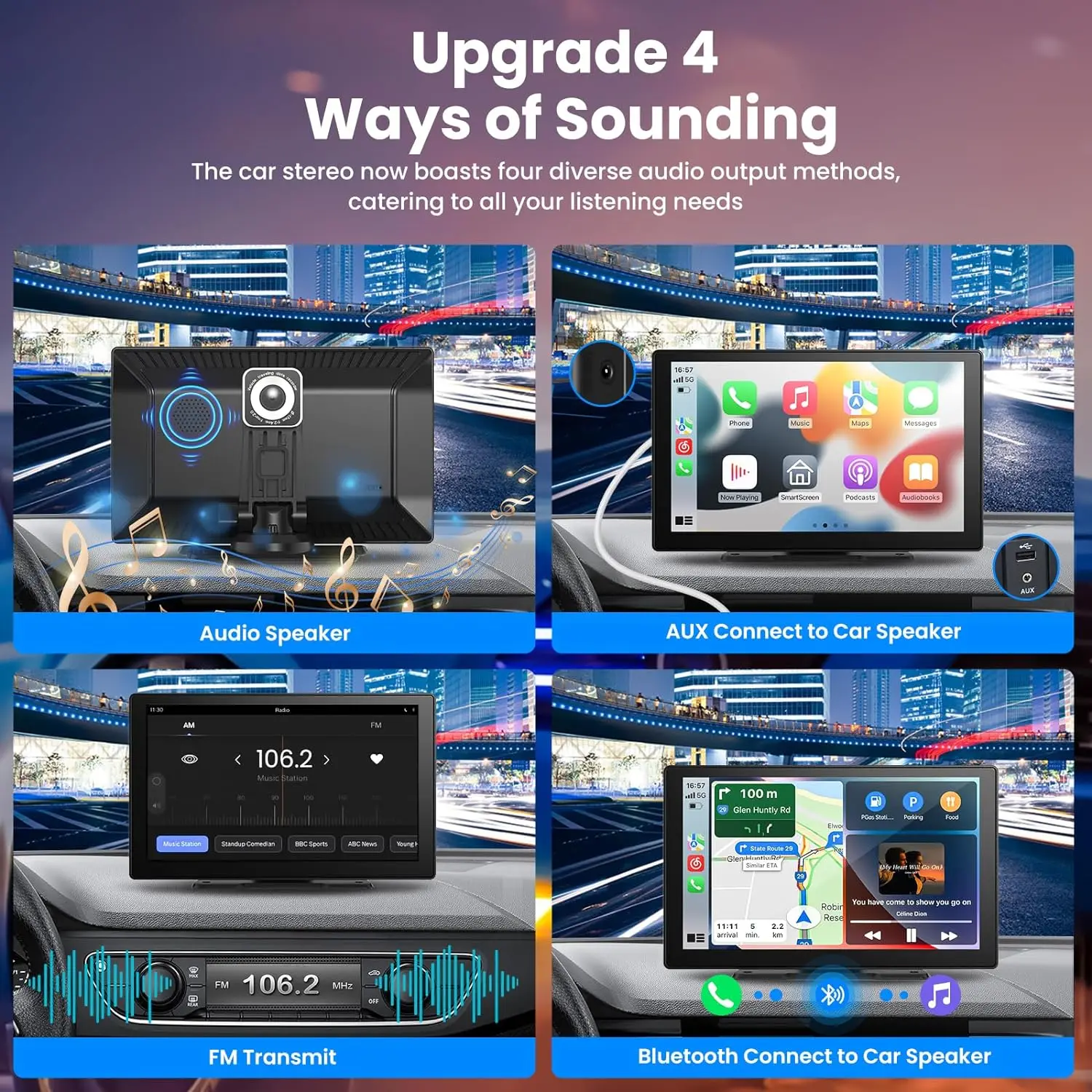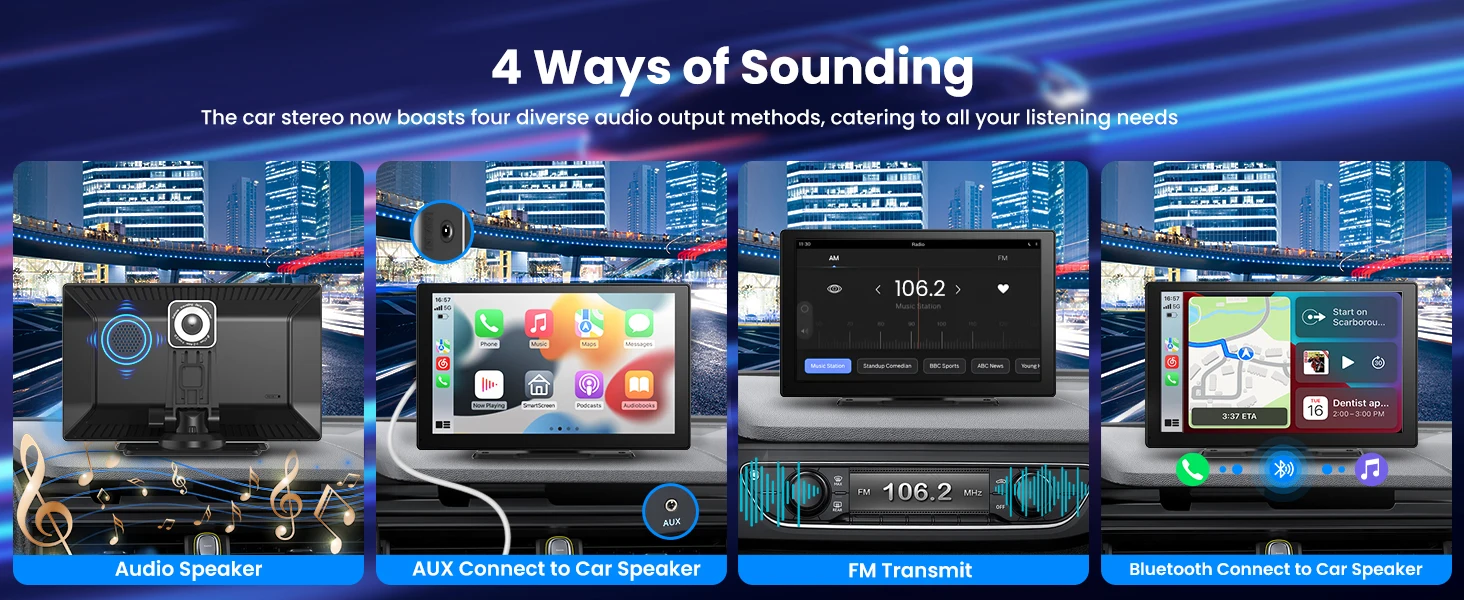 The carplay screen supports multiple audio outputs, including Bluetooth transmit, FM transmit, AUX output and a high-quality built-in speaker, giving you flexible options for enjoying your favorite music and audio content.