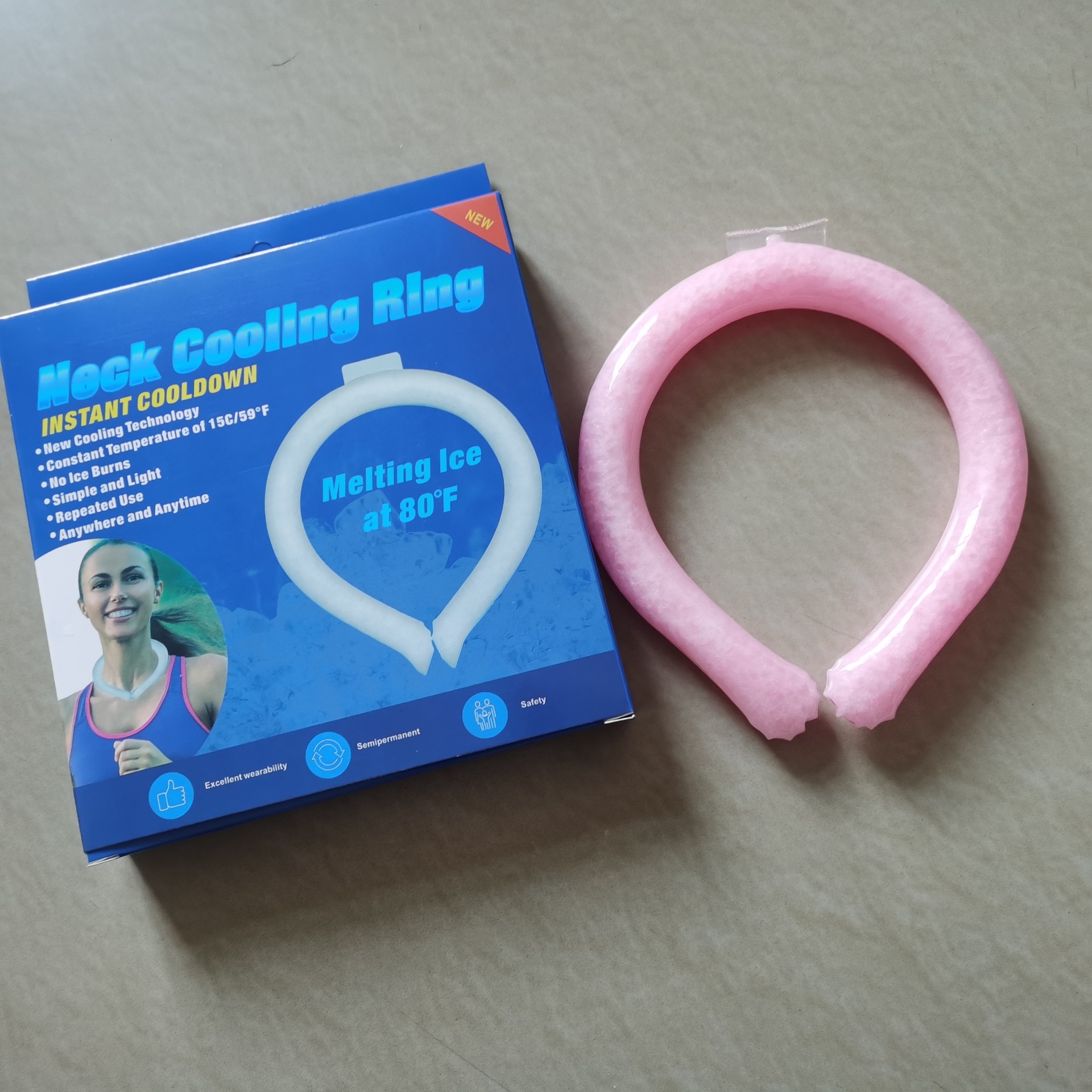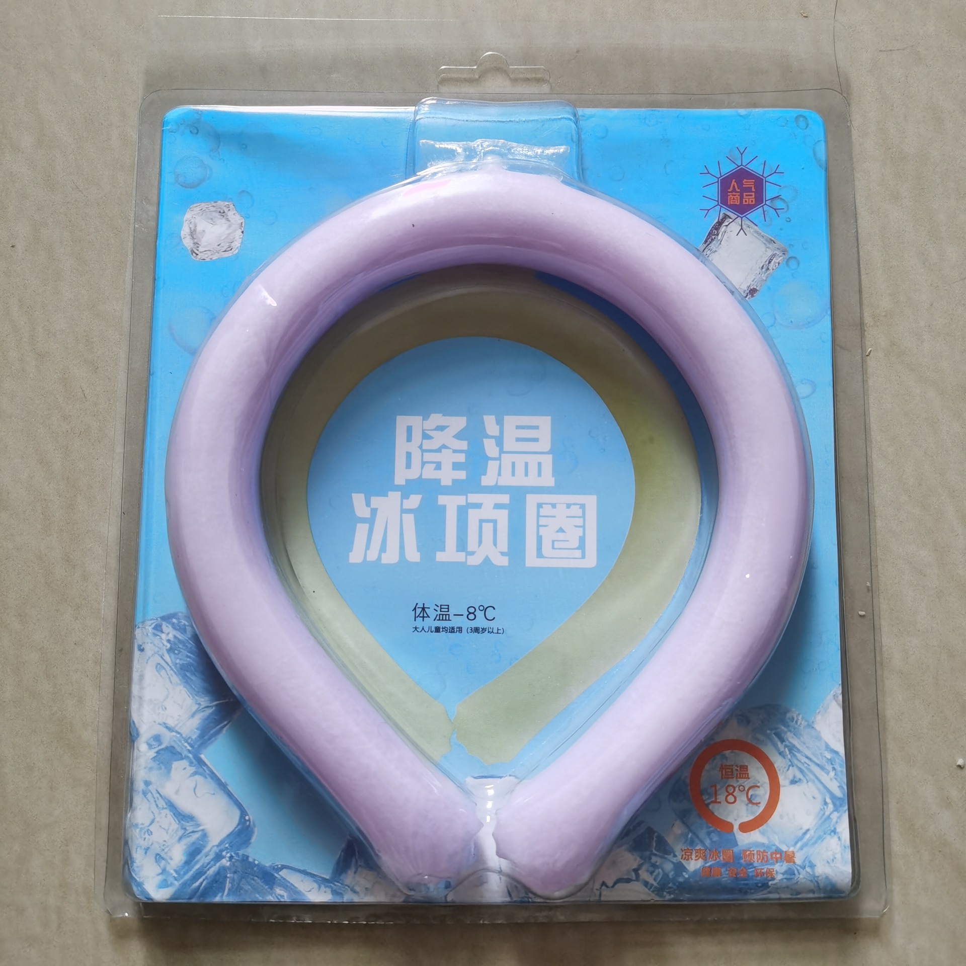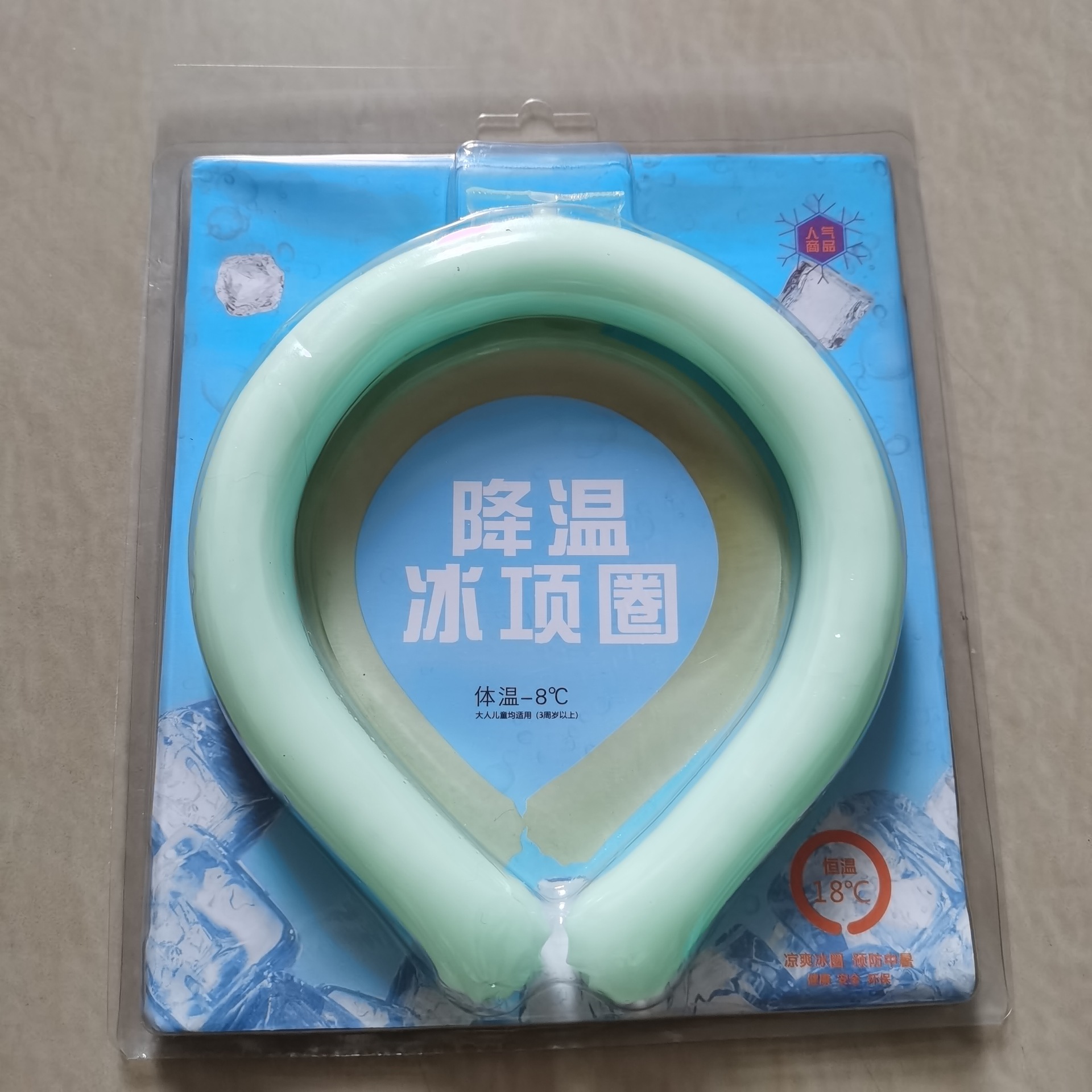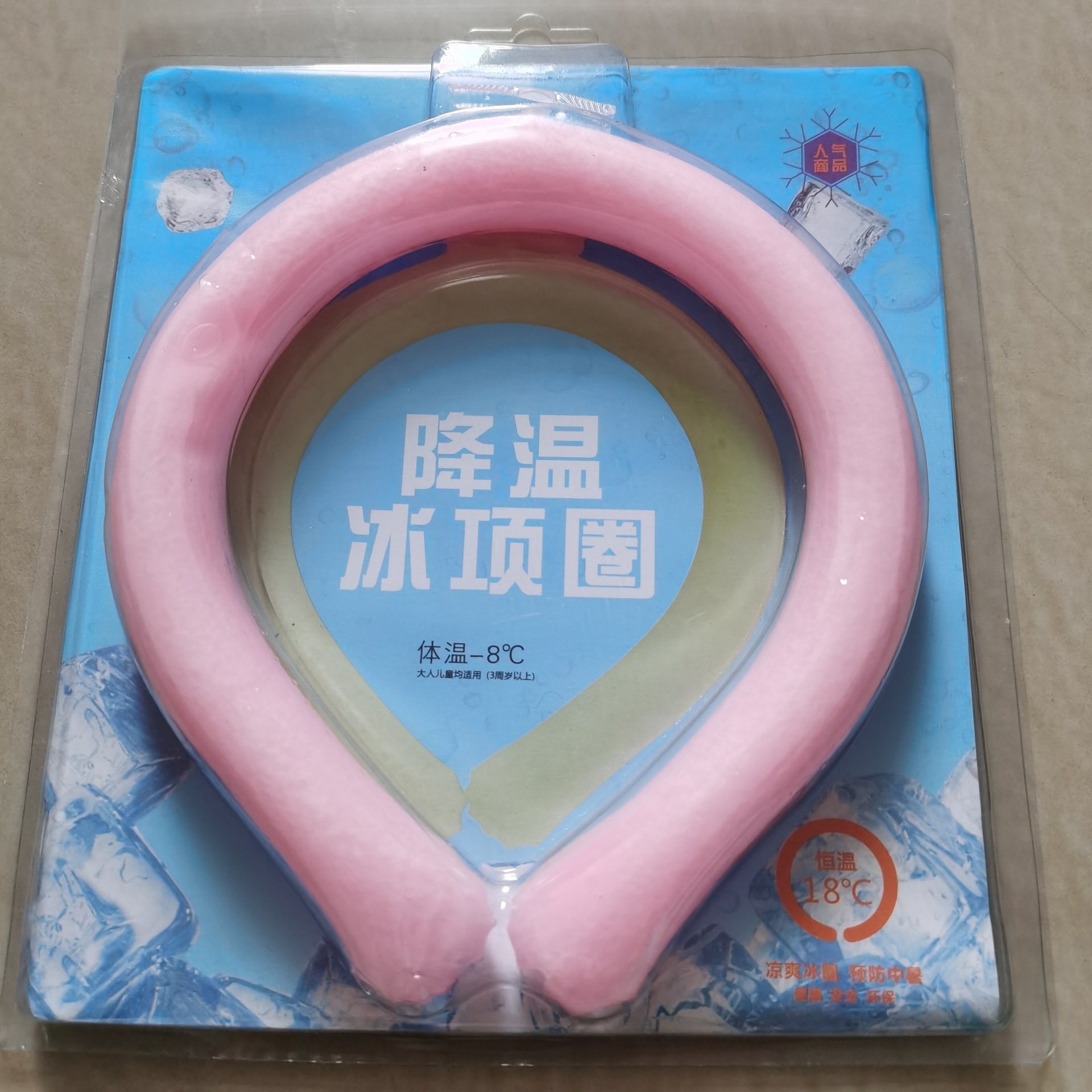 18°C Ice Circle, Usage: Hang it around your neck and it will maintain a cool feeling of 18°C for about 30-40 minutes. It is cool but not icy, and the surface of the product will not condense water to maintain dryness. It can be reused. When the cool circle is in a liquid state, you can put it in the freezer or blow it with the air conditioner for about 20 minutes to restore its ice crystal state, and it can be used for another few dozen minutes until it becomes liquid again. Compared to traditional cooling products like small fans, the advantages of this product are: no need to charge, reusable, can be made into different colors/shapes, frees your hands, compact and portable.