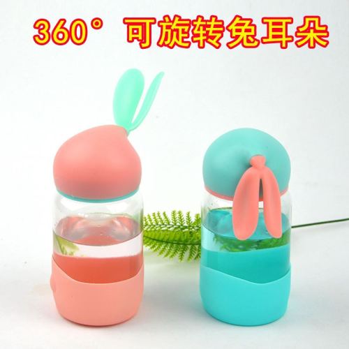 creative cute rabbit ears glass portable handle strap bottle cap student couple portable cup advertising gift cup 中文版