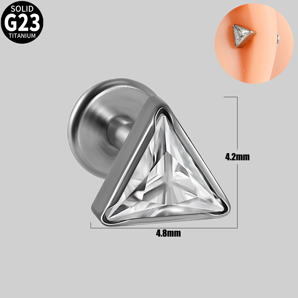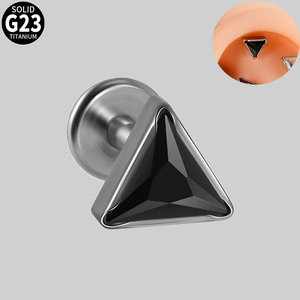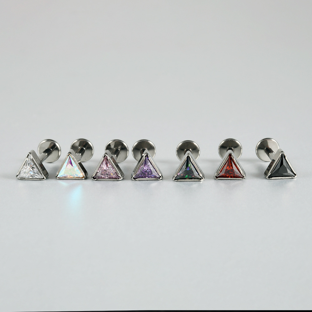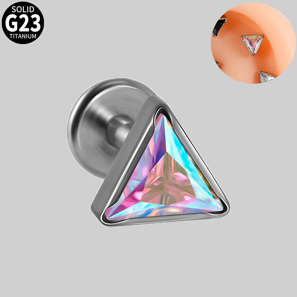 .Name: Cross-border G23 titanium triangle zircon inner thread ear bone pin with multi-color zircon T-shaped flat bottom puncture lip ring