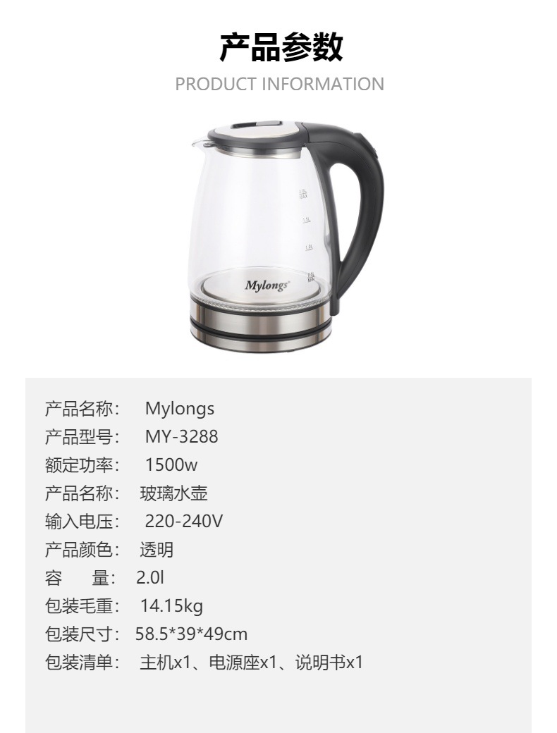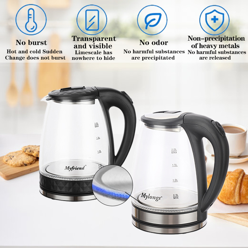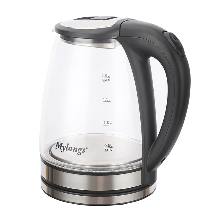 Cross-border trade home use Mylongs 1.8L stainless steel high borosilicate glass transparent electric kettle electric water heater wholesale