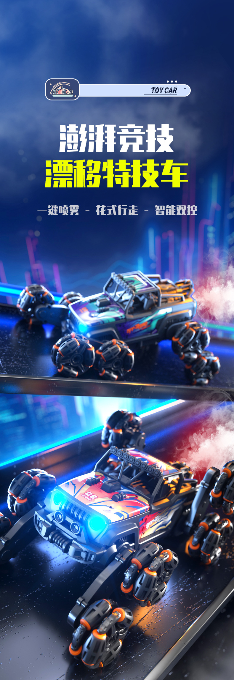 【Product Function Introduction】Music - Front wheel up.down - Automatic demonstration - Rear wheel up.down - Spray - Forward.backward - Left turn.right turn