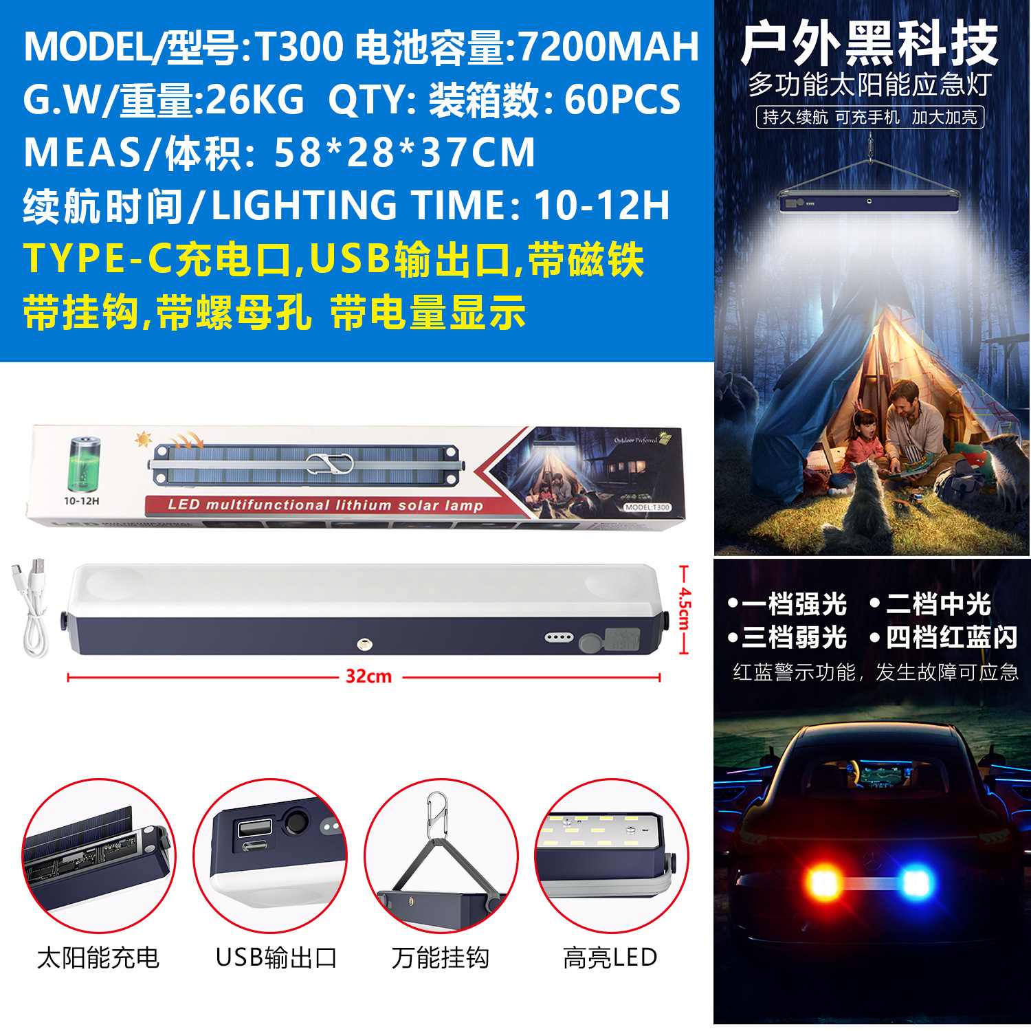 t300 with solar power bank function with hook with magnet endurance 10-12 hours