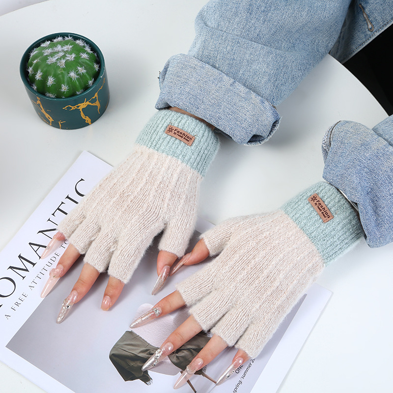 stitching half finger gloves [khaki + blue]]
