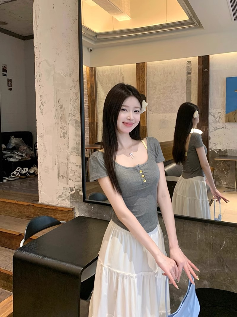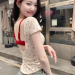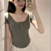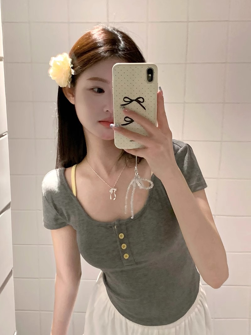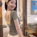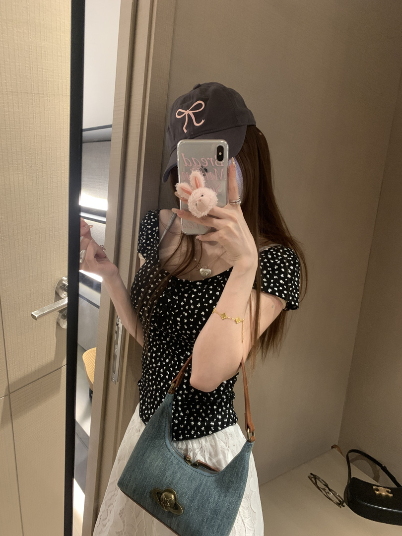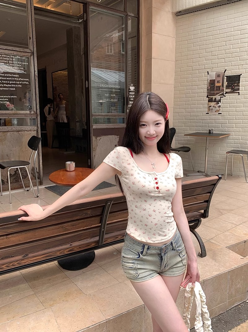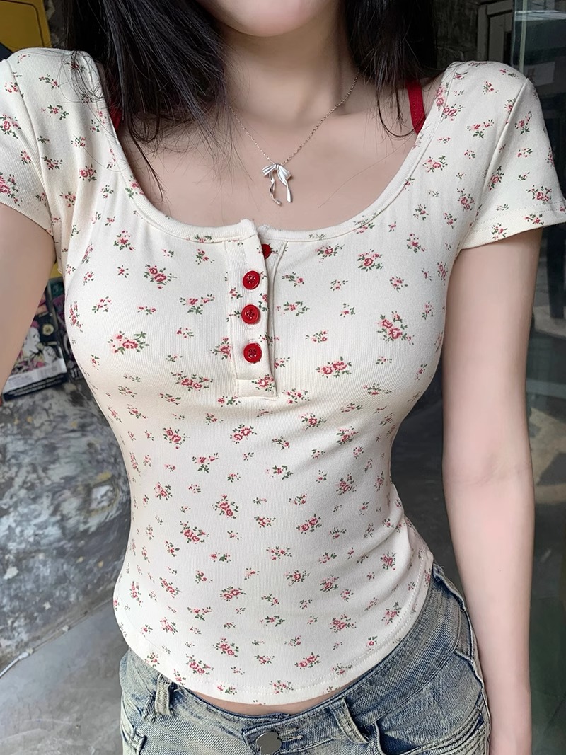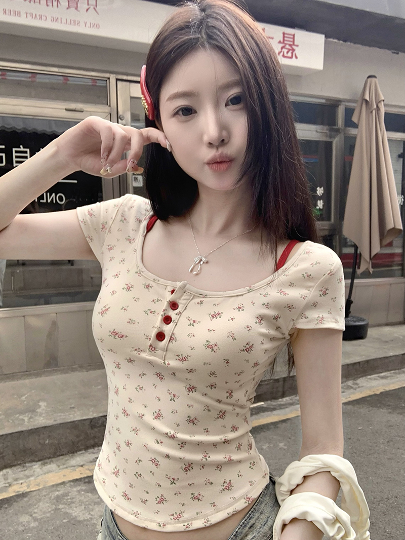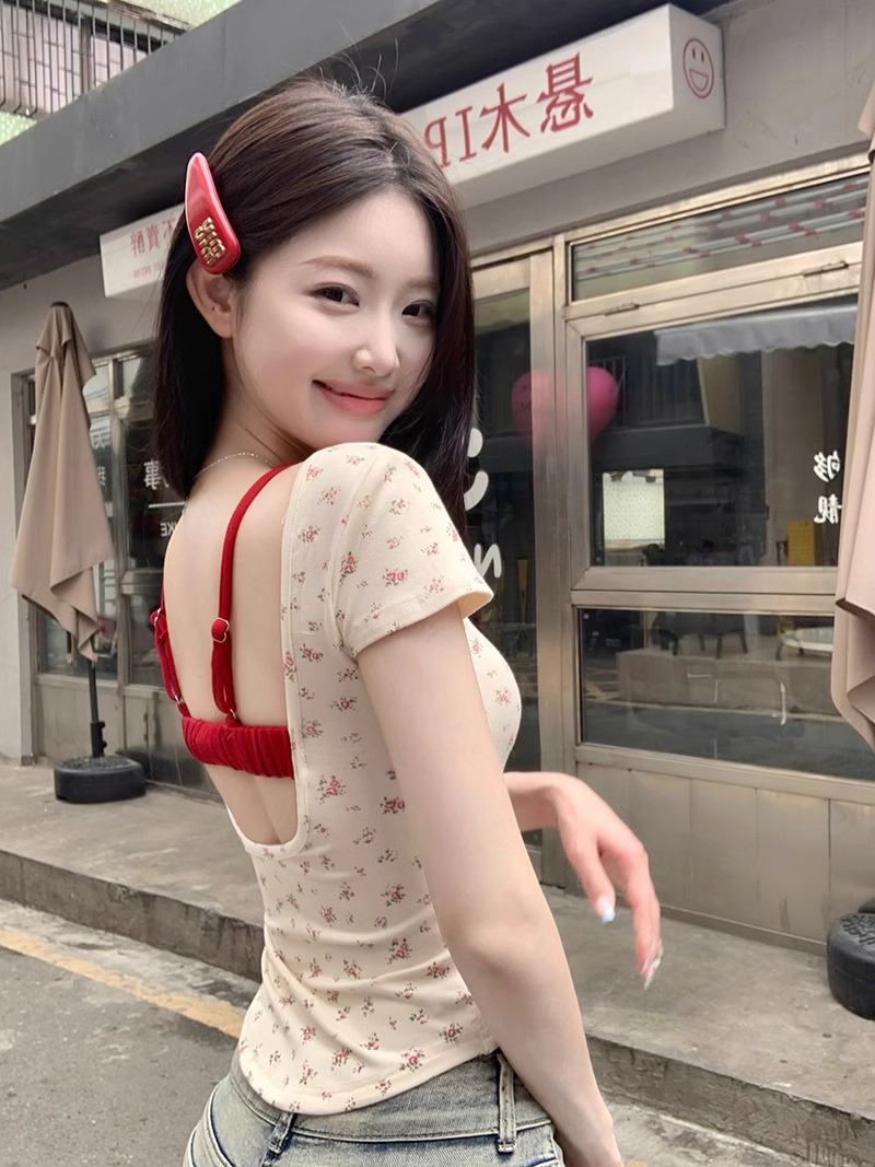 women's korean-style floral short-sleeved t-shirt with chest pad summer slim-fit short pure backless high-grade off-shoulder short top
