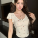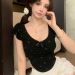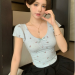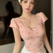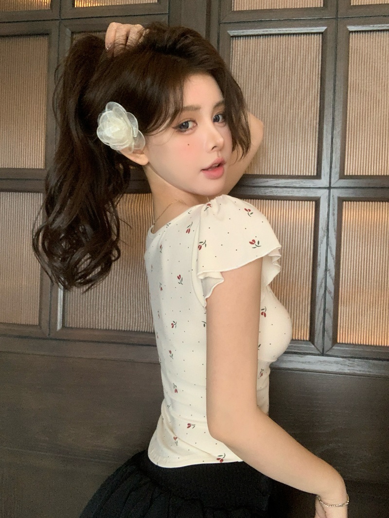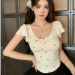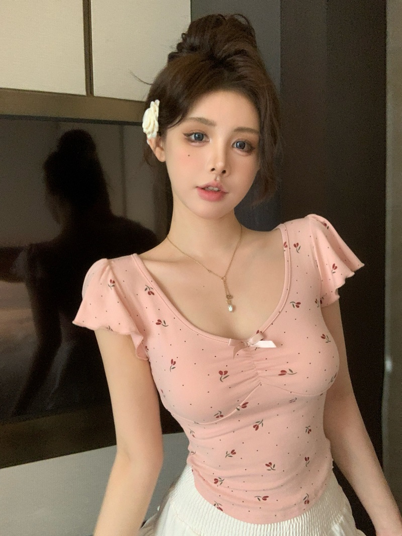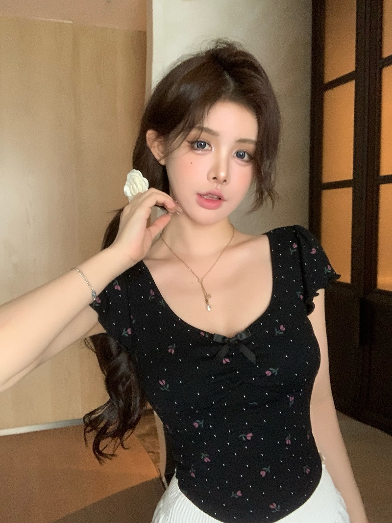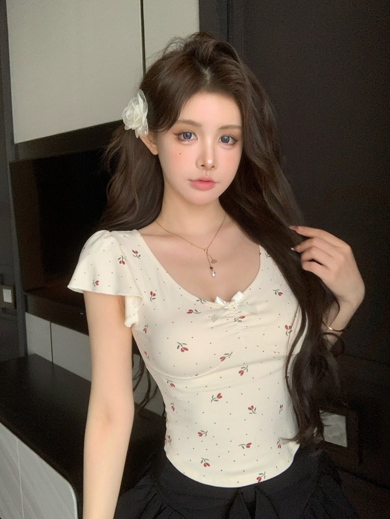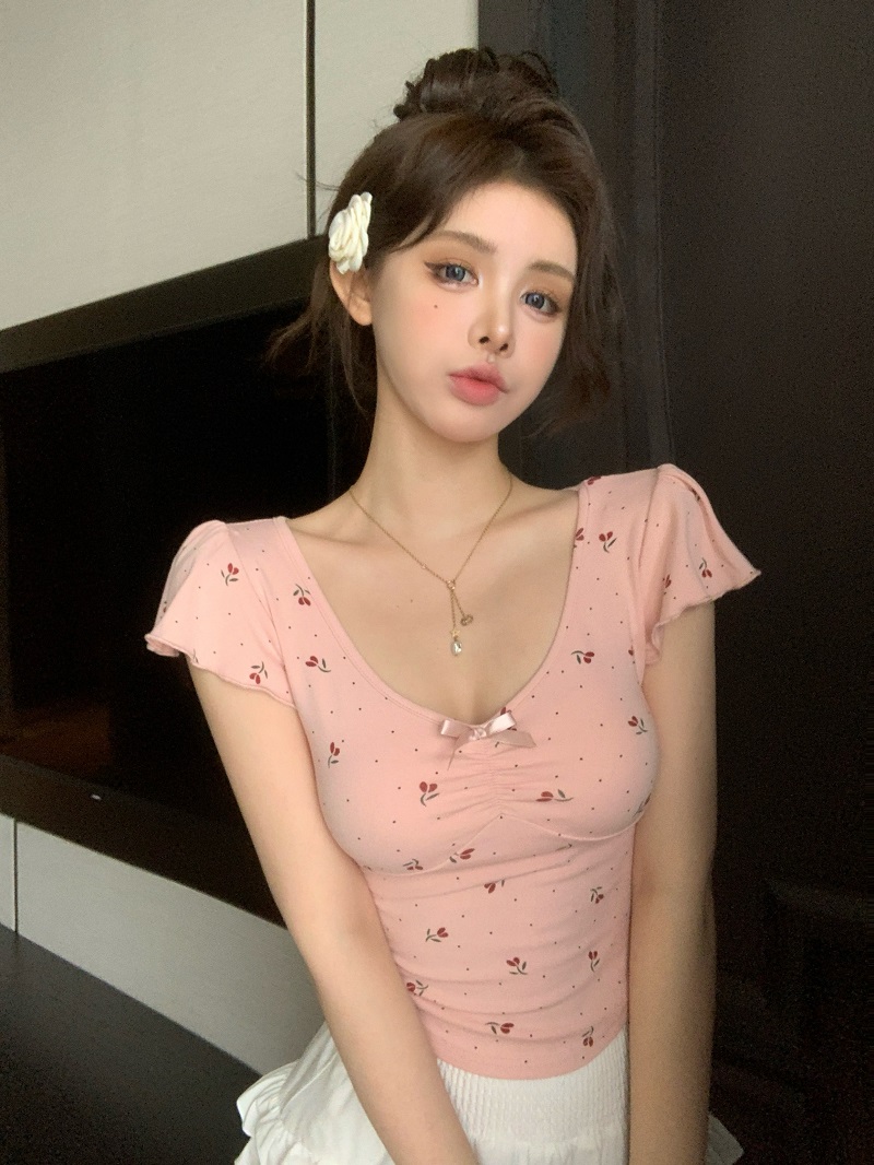 bowknot v-neck floral shoulder short-sleeved t-shirt women's summer pure sweet hot girl irregular short slim top fashion
