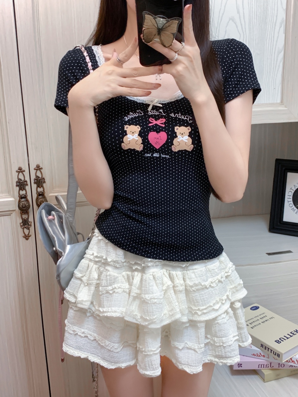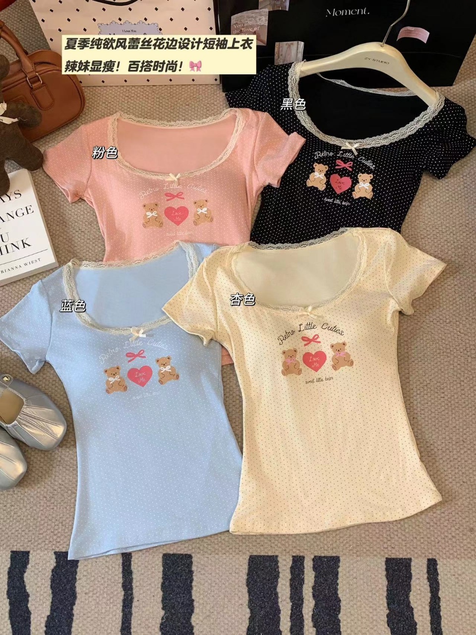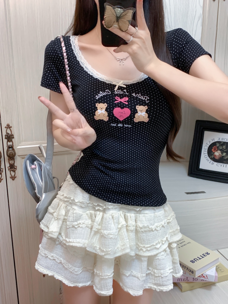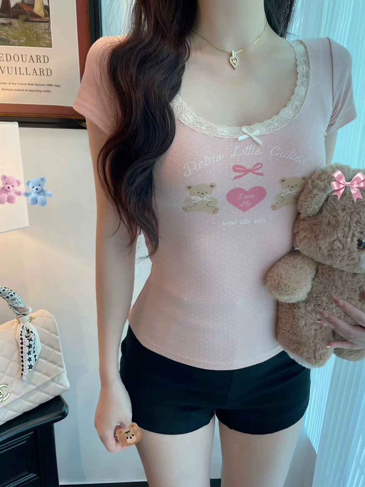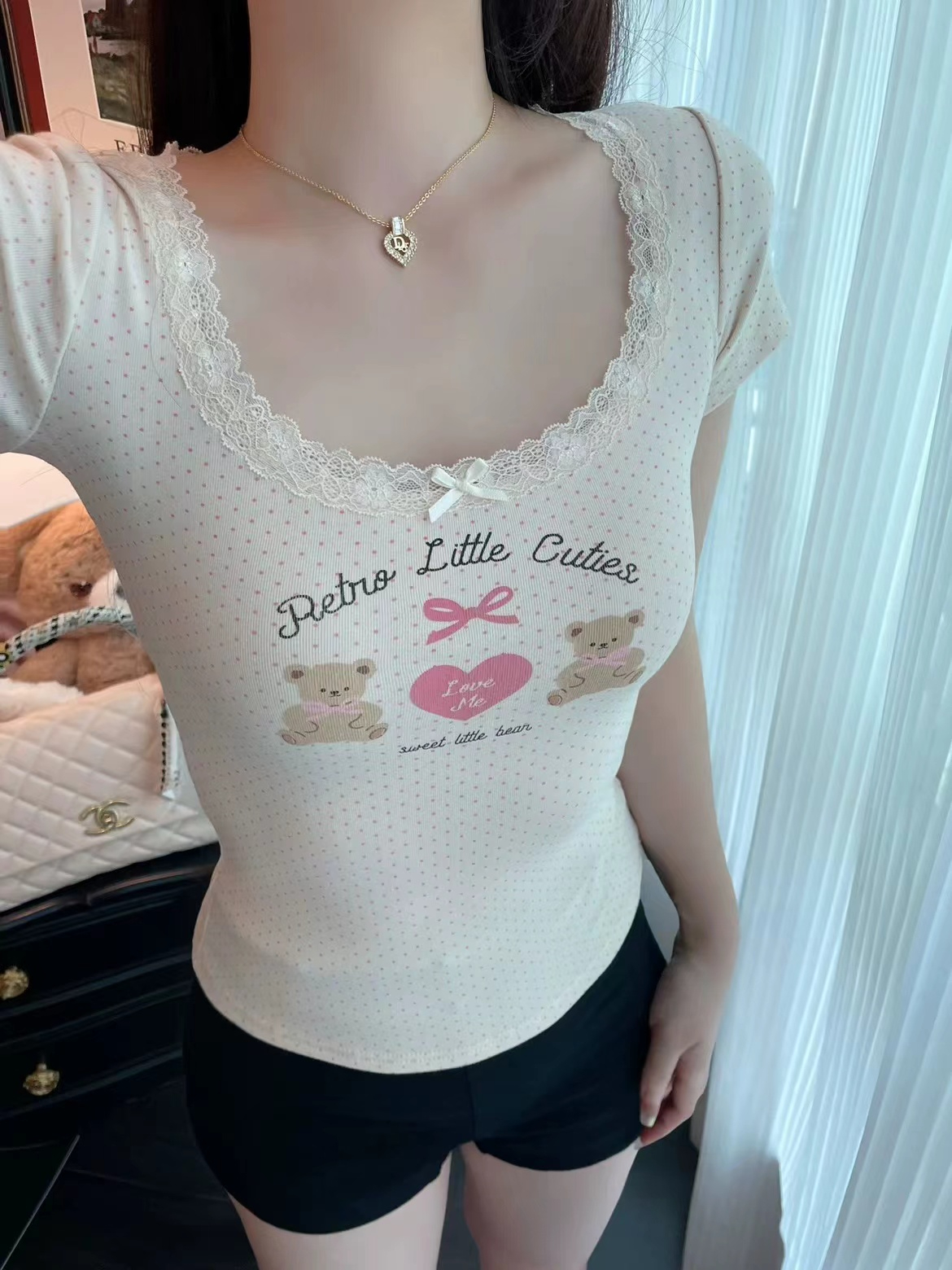 fashionable printed short-sleeved t-shirt for women summer niche beautiful small slim fit slimming short top lace