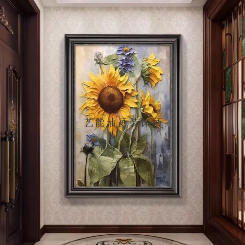 Sunflower entrance decoration painting with a sense of high-end luxury and atmosphere, suitable for American-style living room sofa background wall hanging painting, hand-painted oil painting. Contact 18042587889 for more information.Update time: