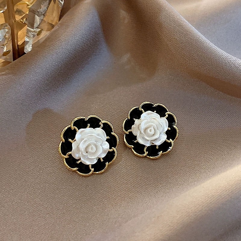 14# black and white rose stud earrings