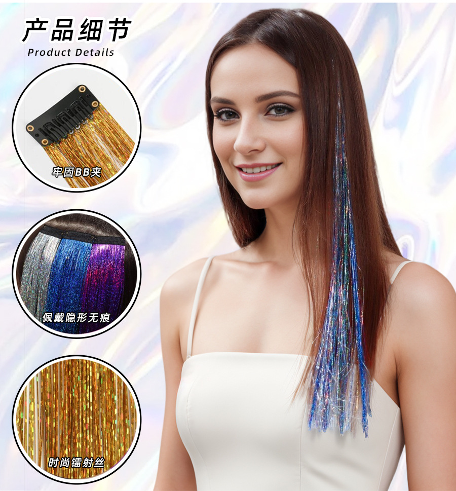 wholesale laser silk ear hanging hair extension wig female one-piece color hair extension seamless bb clip gold and silver silk colorful silk