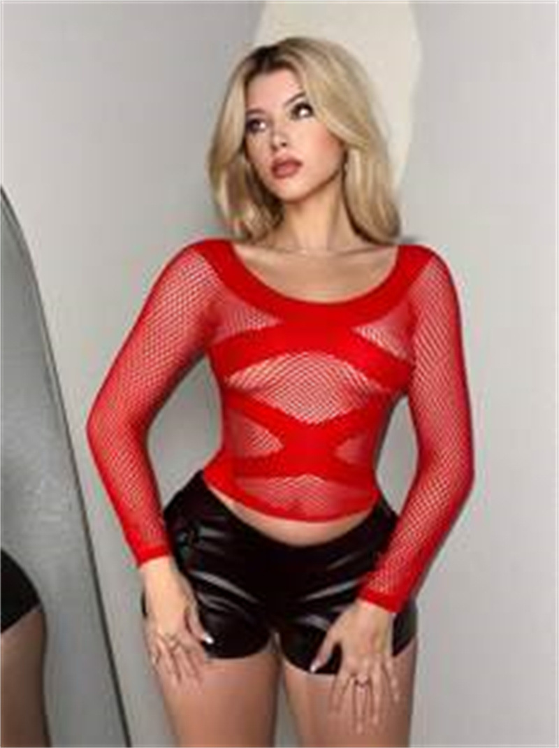cross-border hollow-out fishnet see-through navel sexy short red top women's european and american foreign trade factory wholesale fishnet clothes