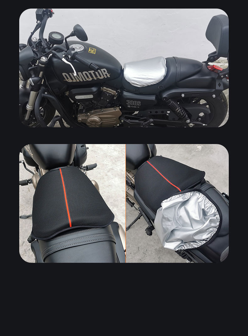 Product Features: This product is multi-functional, with a silver outer layer that provides sun protection, cooling, and water resistance. The second layer is a high-weight tri-twill fabric that offers breathability. The third layer is a shock-absorbing layer, making it ideal for long-distance cycling. The fourth layer is a non-slip layer, securely attached to the motorcycle seat with elastic bands.