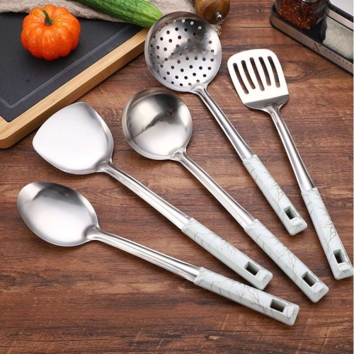 jieyang factory direct sales stainless steel kitchenware spatula set white stone pattern handle shovel spoon colander kitchen dedicated kitchenware 中文版