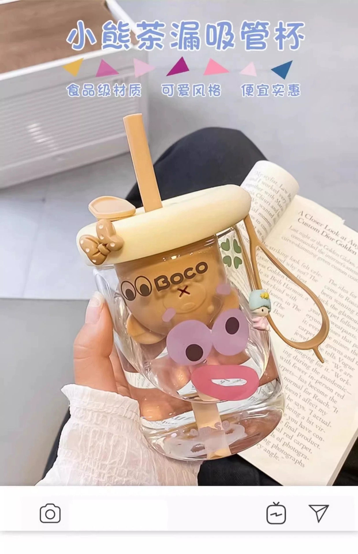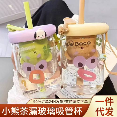 bear tea strainer glass straw cup-brown