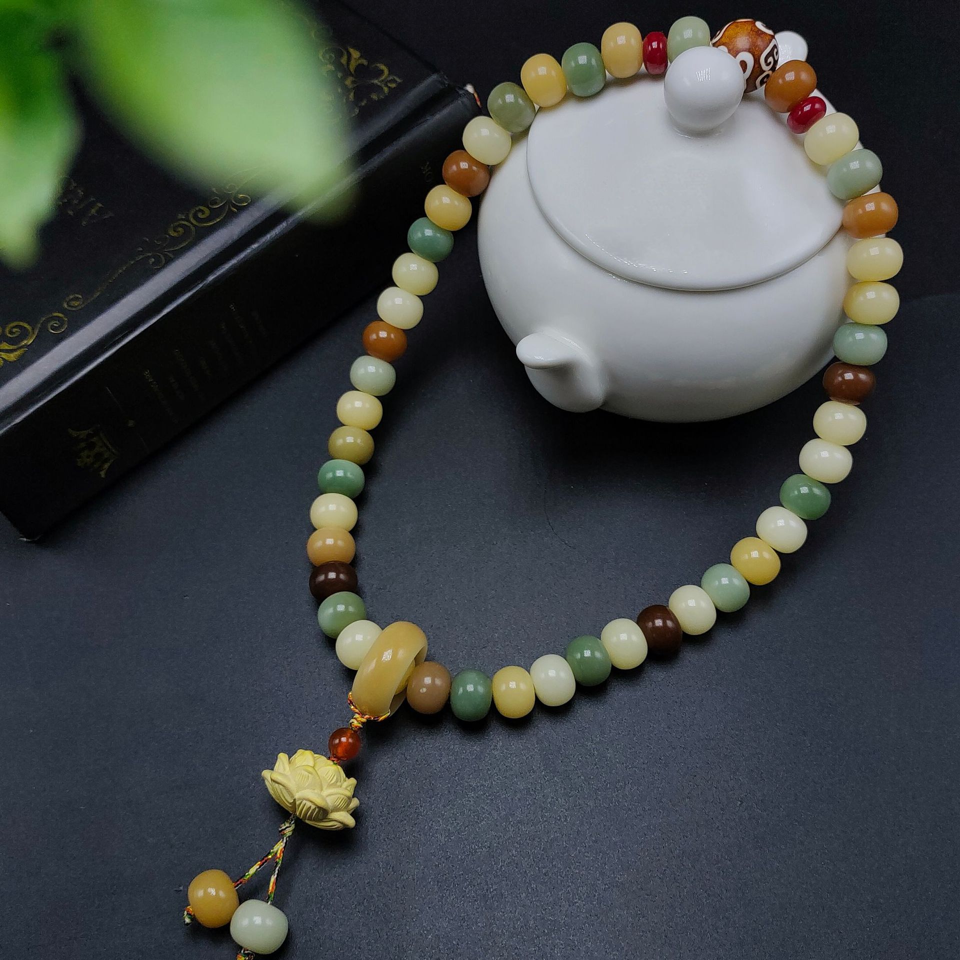 Material: Bodhi root about 8*10 mm, Agate Tibetan beads, Yellow willow wood lotus Buddha, Bodhi running ring, powder pressed awake lion.