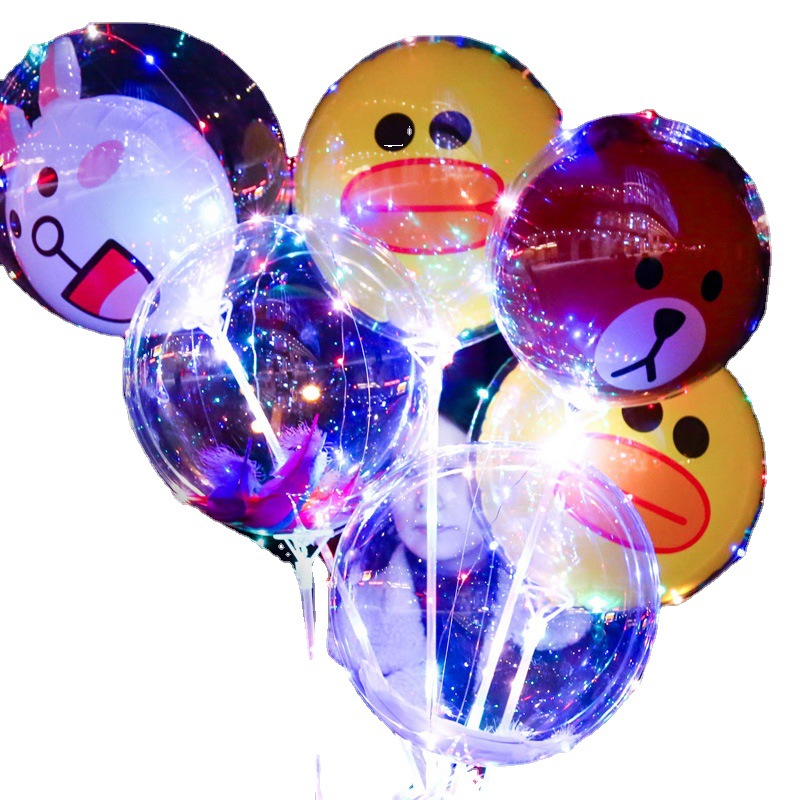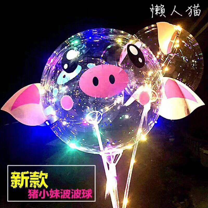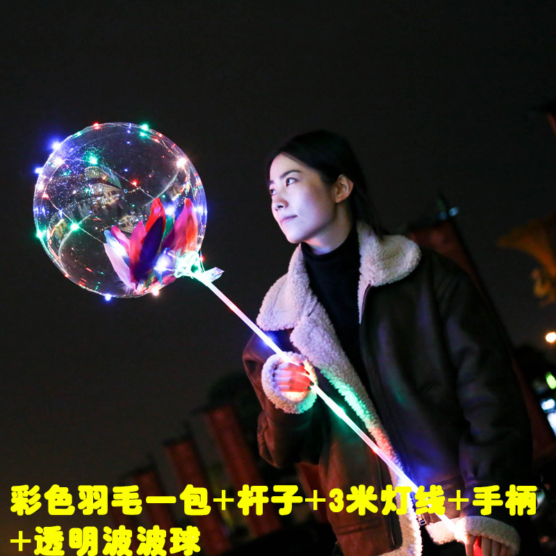 The price includes: one transparent balloon (20.5 inch thickened), one cartoon inner ball, one 70CM pole (40 cm connecting bar with one interface), approximately 3 meters of light cord, 30 light bulbs (yellow, blue, pink, green), and a battery box (uses 2 AA batteries, not included).