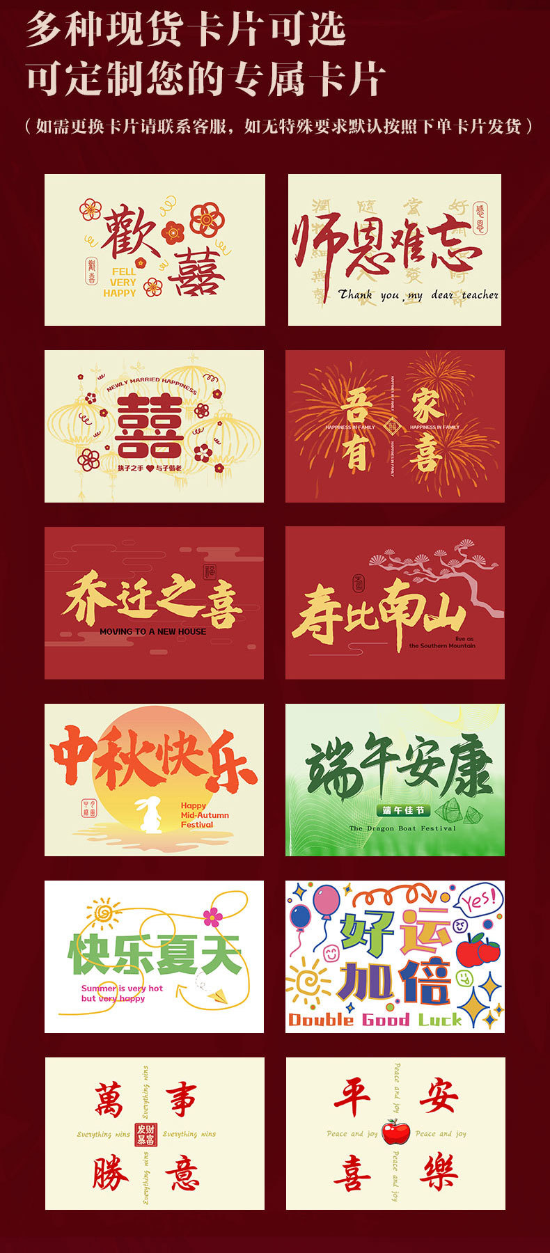 ten sets of customized covers (please contact customer service)