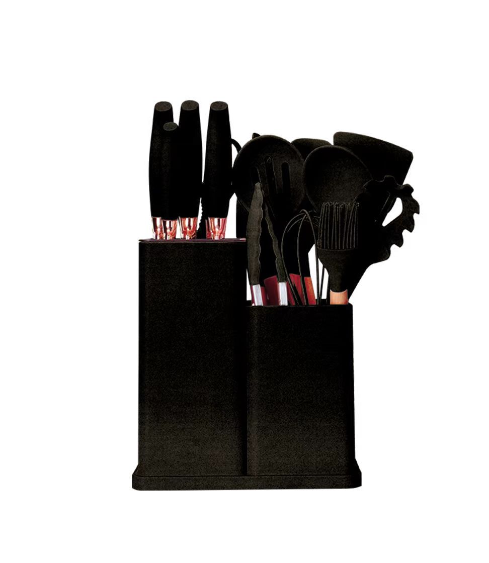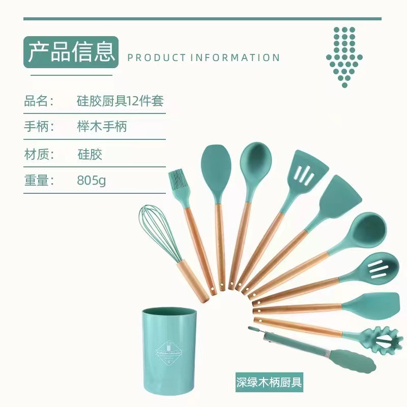 wooden handle silicone kitchenware 19-piece non-stick pan cooking ladel kitchenware with storage bucket knives combination suit 中文版