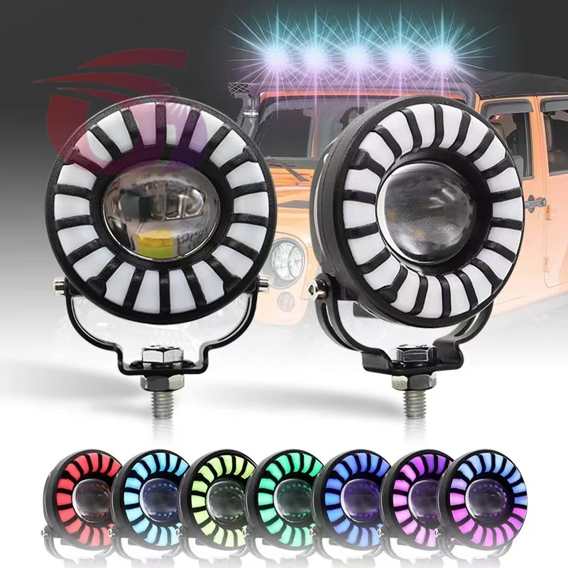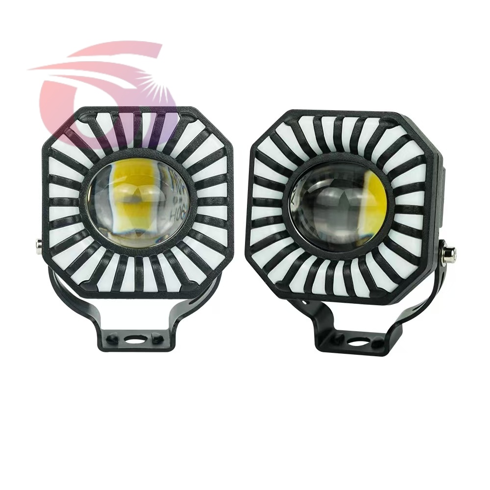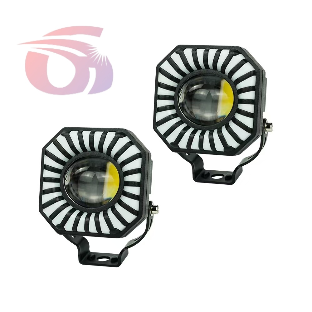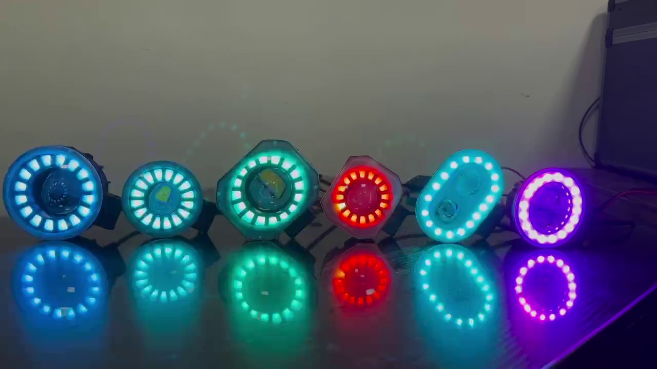 Car LED lights of motorcycle, colorful spotlights, round yellow and white spotlights.