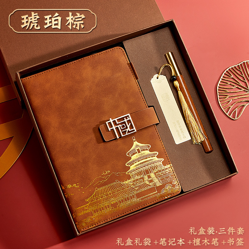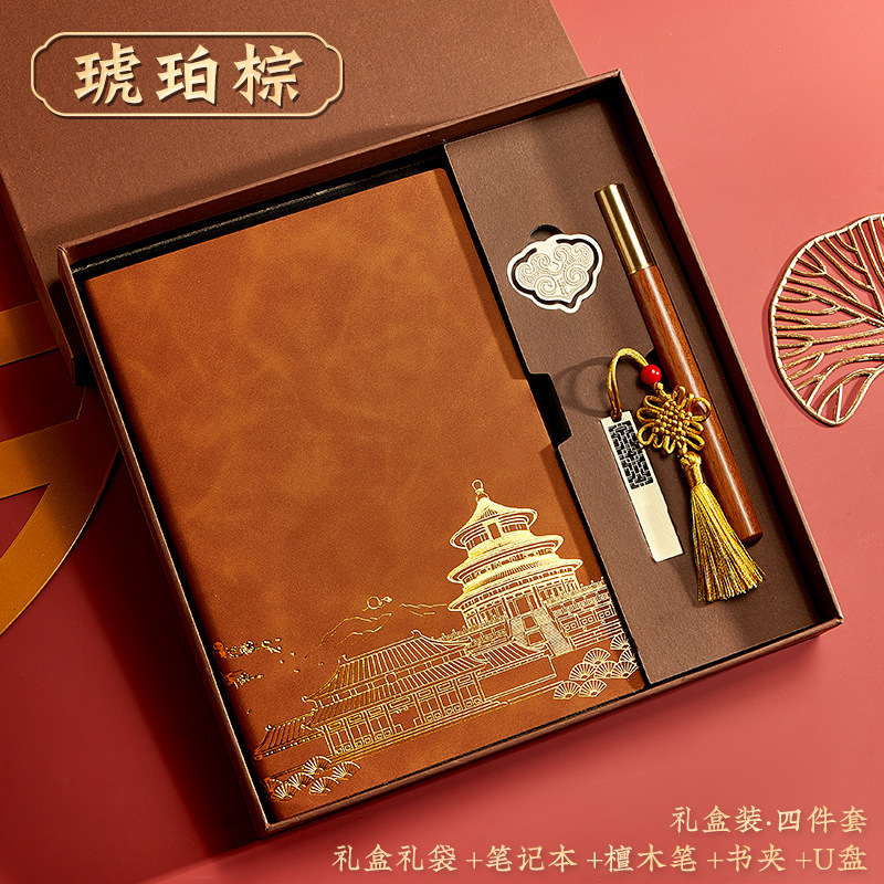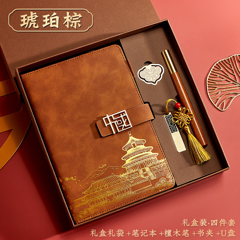 brown-a5 intimate book-chinese buckle-gift box-bookmark-pen-u disk
