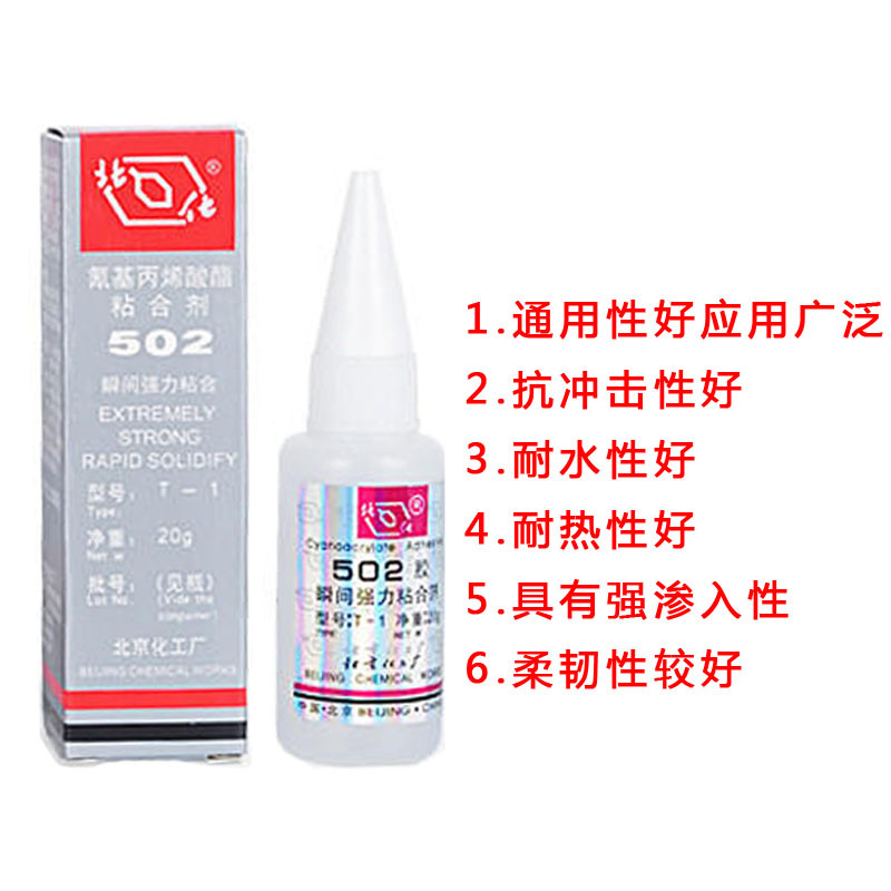 502 glue is a single-component, hydrogen-based acrylic adhesive with a variety of excellent performance characteristics. It does not require solvents or heating, cures instantly at room temperature, and offers high strength. It is widely used for bonding metals, rubber, plastics, wood, ceramics, and more.