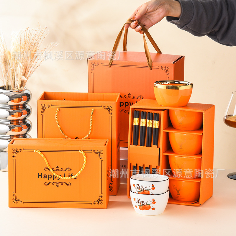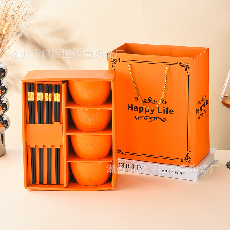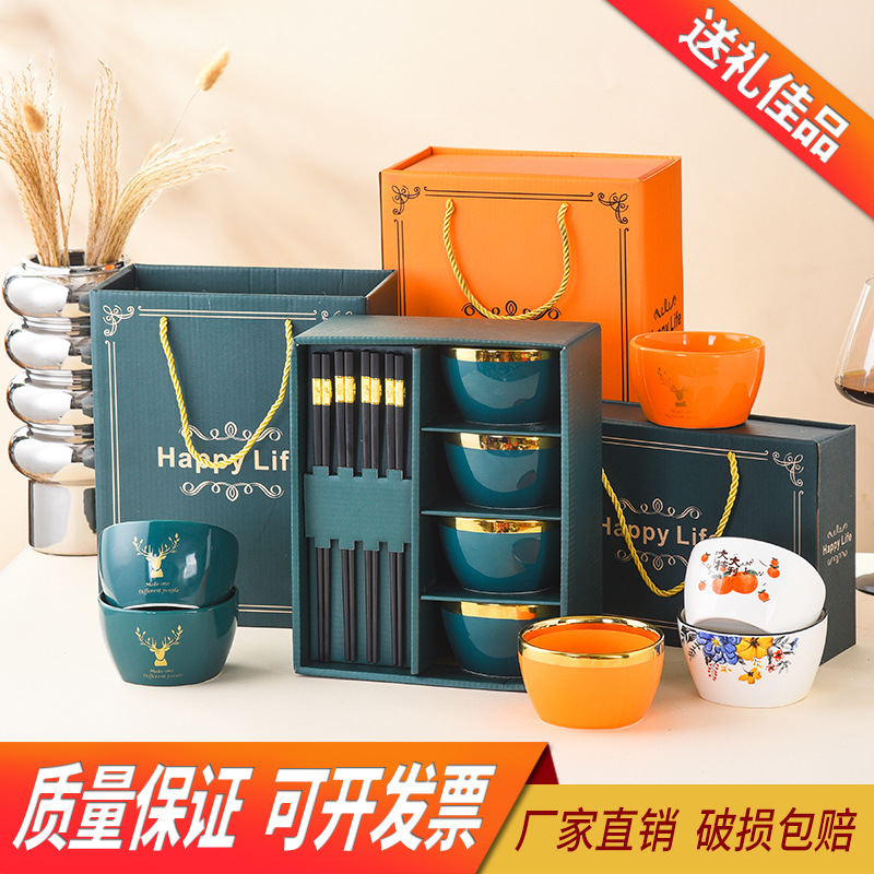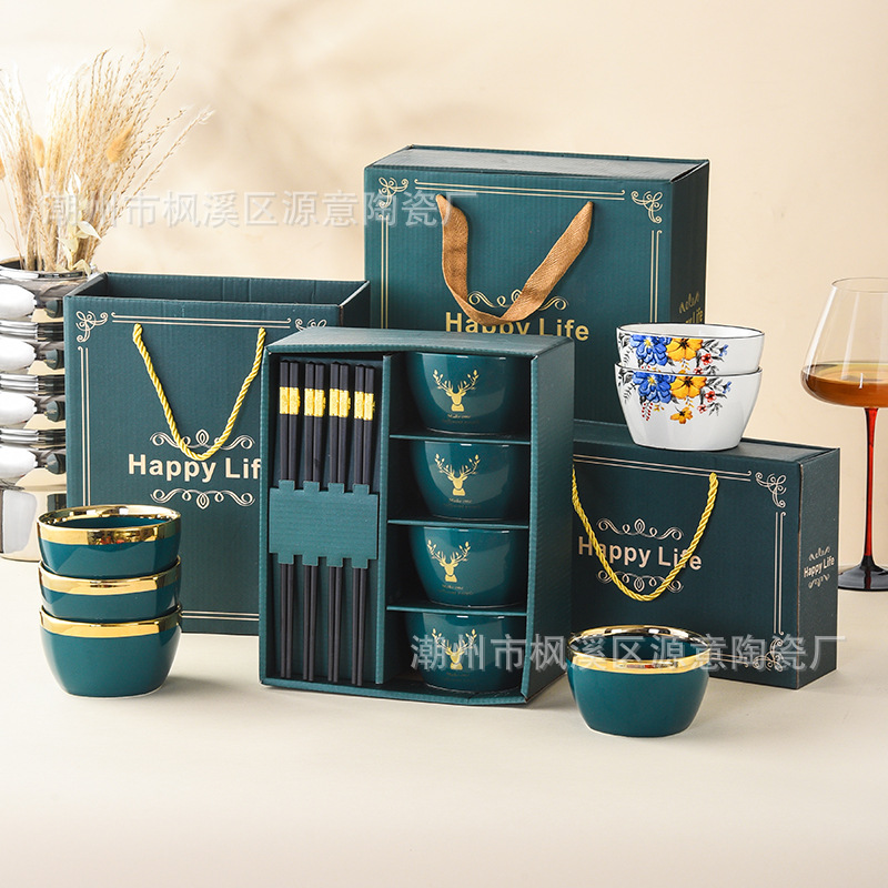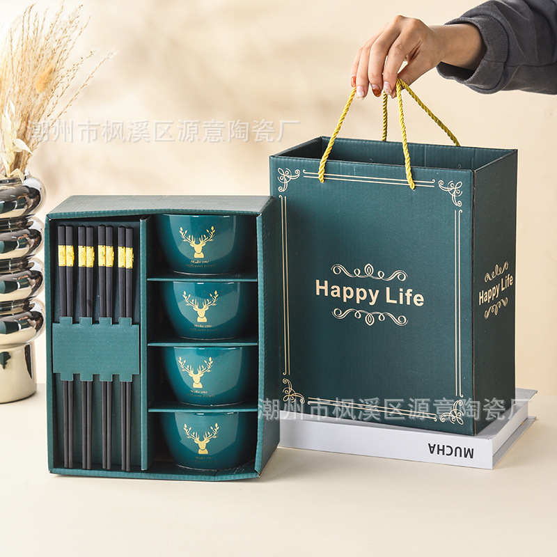 ceramic square bowl and chopsticks suit deer have you golden edge glazed bowl gift box tableware festival opening activity gift set bowl
