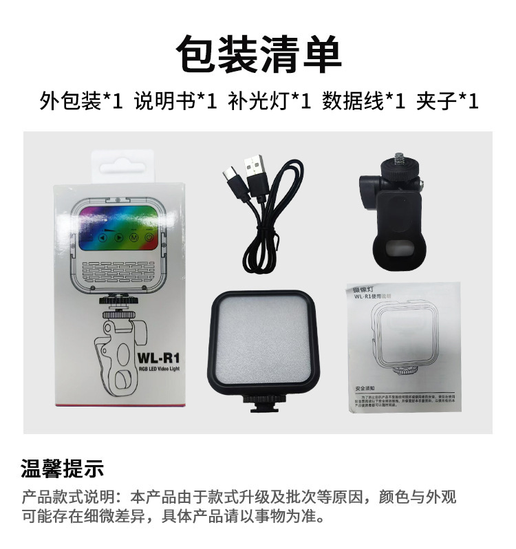 白光单色款-补光灯+热靴夹+三脚架+口袋灯夹子
