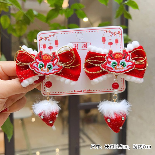 antique red bow barrettes female children's han chinese costume fur ball ribbon princess headdress baby new year spring festival hairpin 中文版