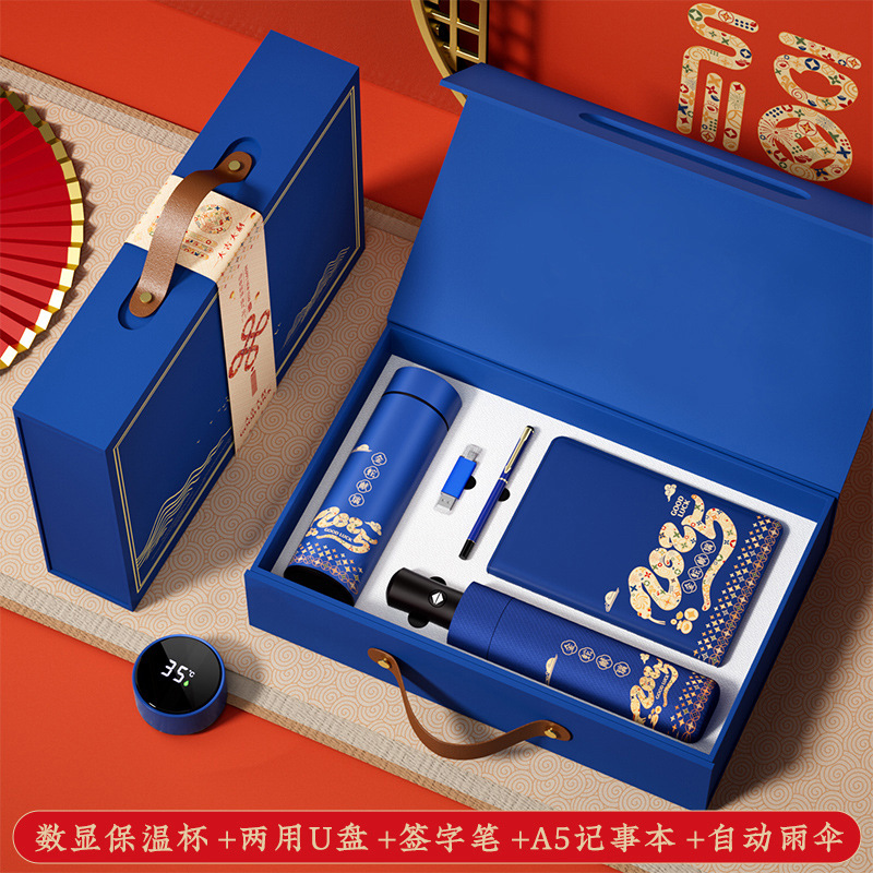 保温杯+雨伞+充电宝+笔+u盘+笔记本-蓝色