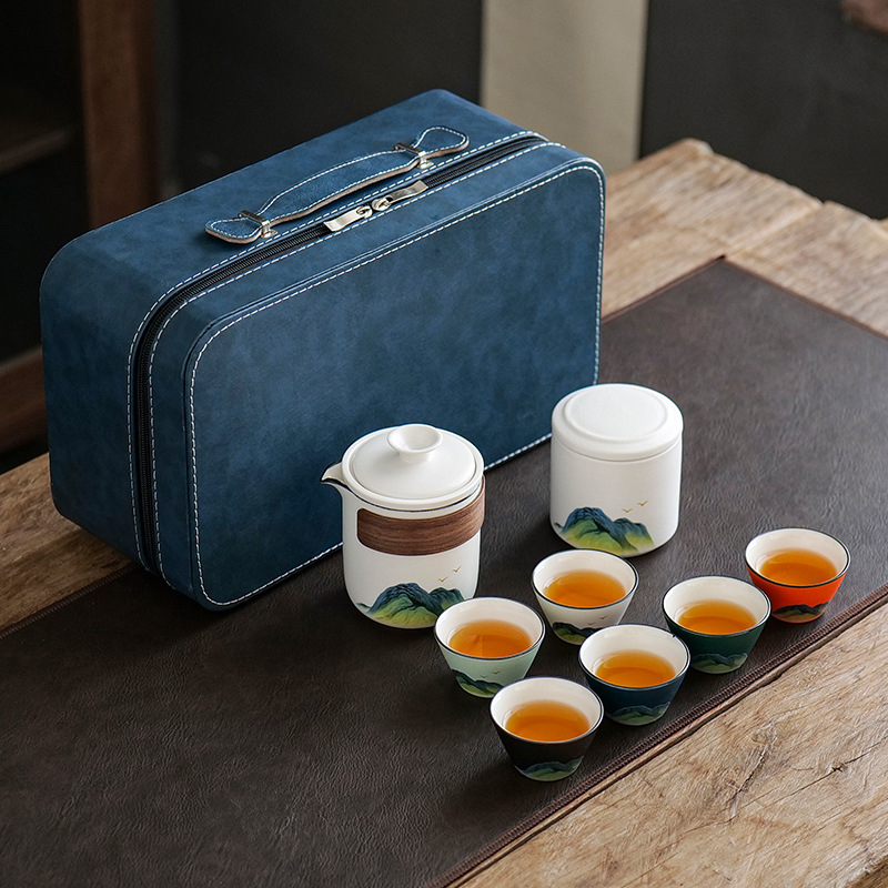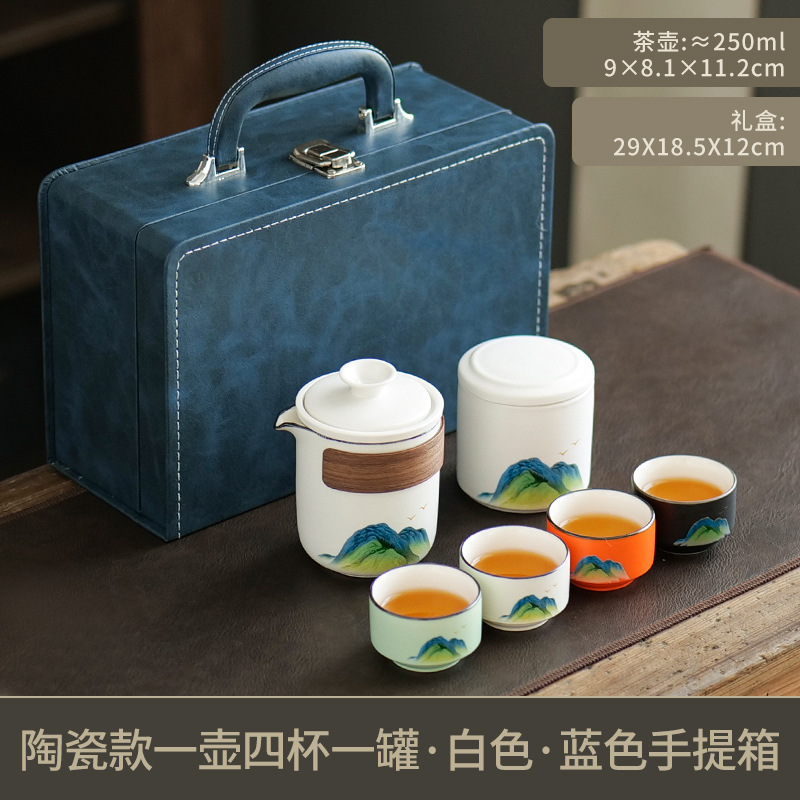 leyan ceramic white landscape [four colors] one pot four cups with cans [blue small suitcase]]