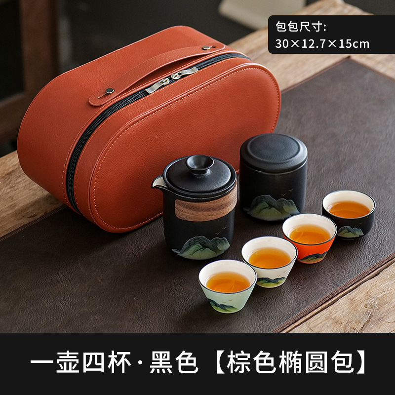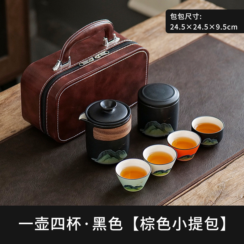 leyan ceramic black landscape [four colors] one pot four cups with cans [brown small lether bag]]