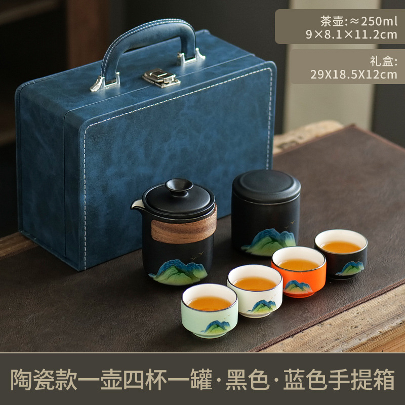 leyan ceramic black landscape [four colors] one pot four cups with cans [blue small suitcase]]