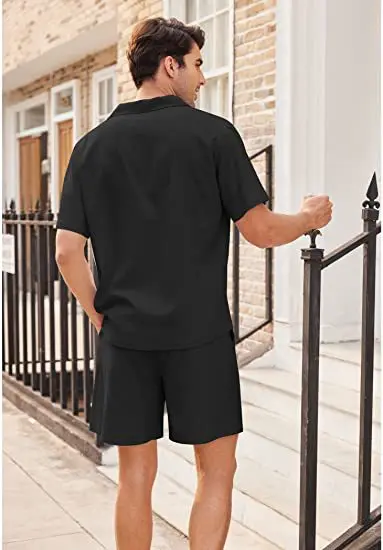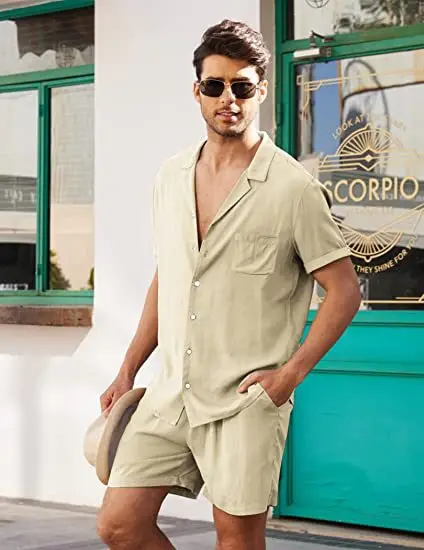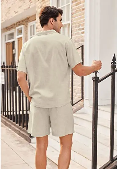 OEM&ODM Men Summer Beach Cotton Linen Shirt And Short 2 Piece Set Mens Linen Pants