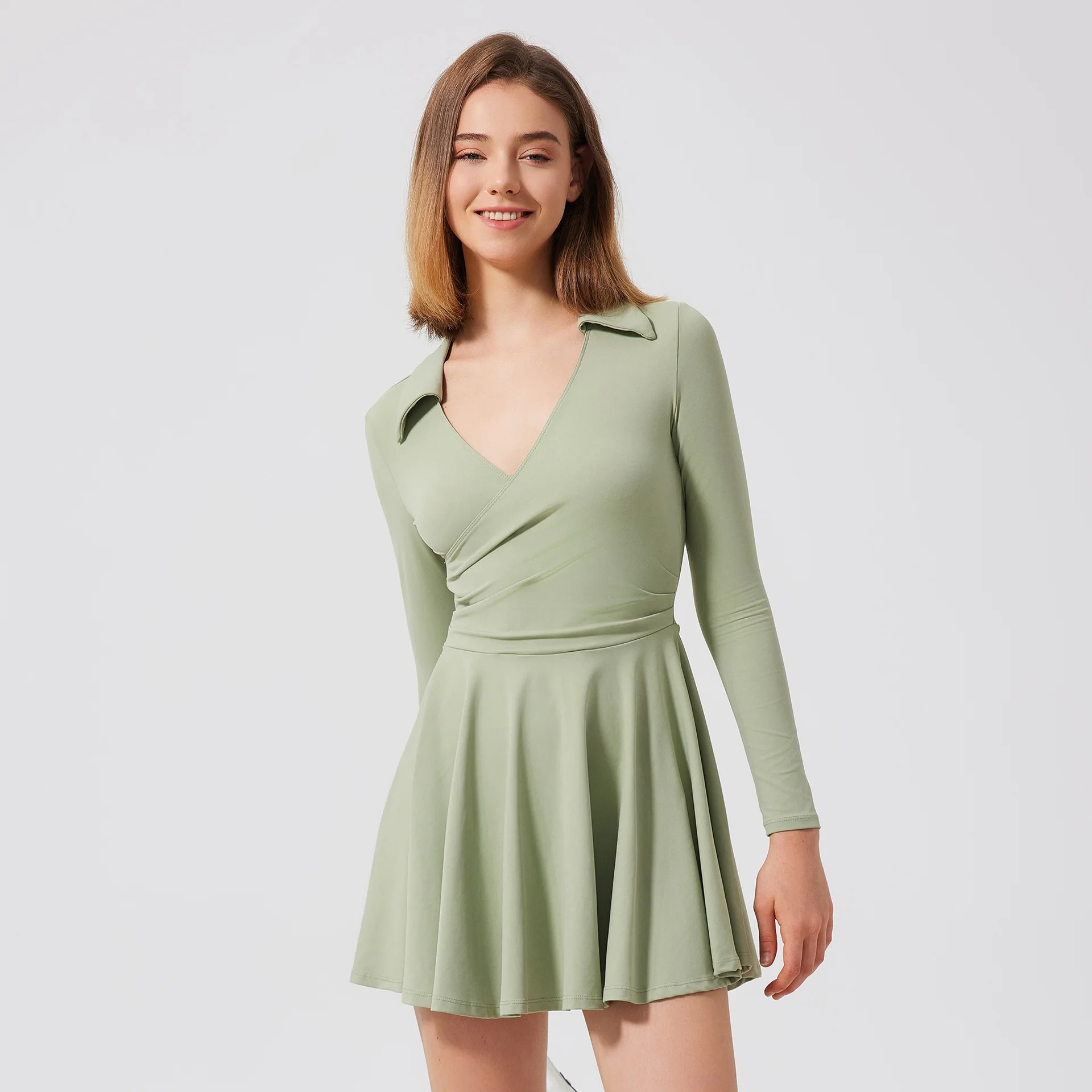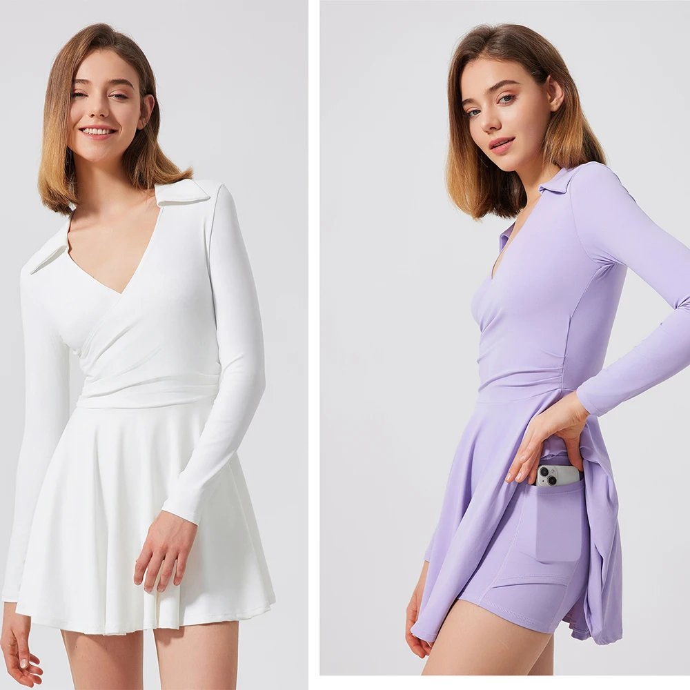 tennis wear sexy Women V-neck long sleeve skinny tennis dress with shorts woman golf wear fitness yoga dresses running clothes
