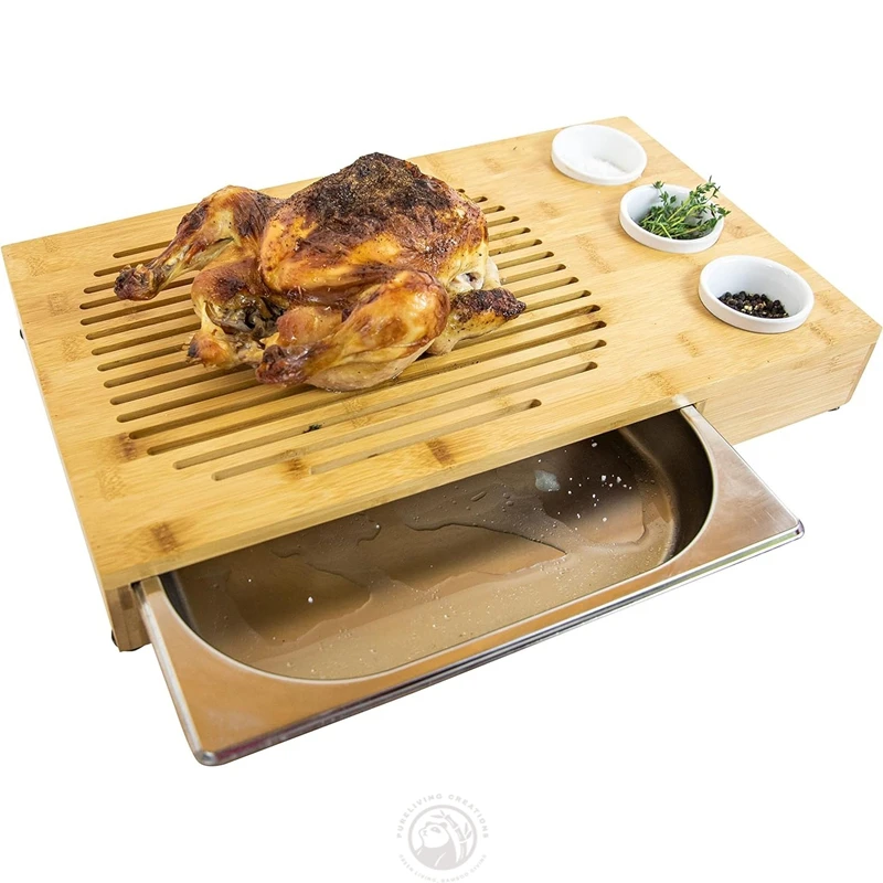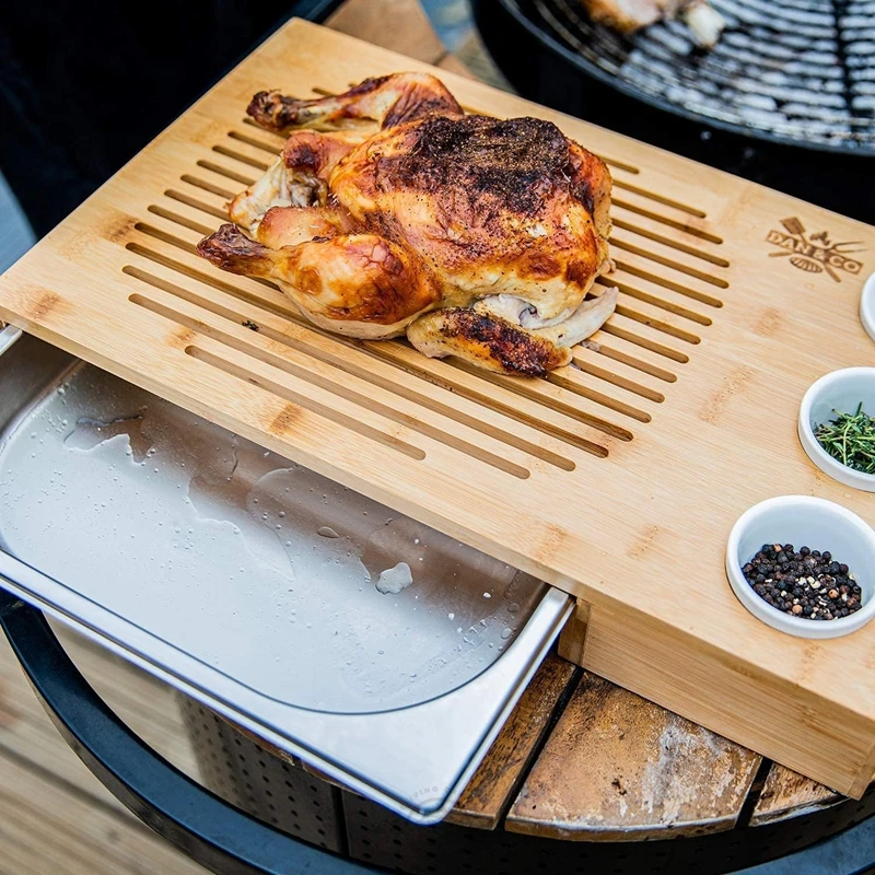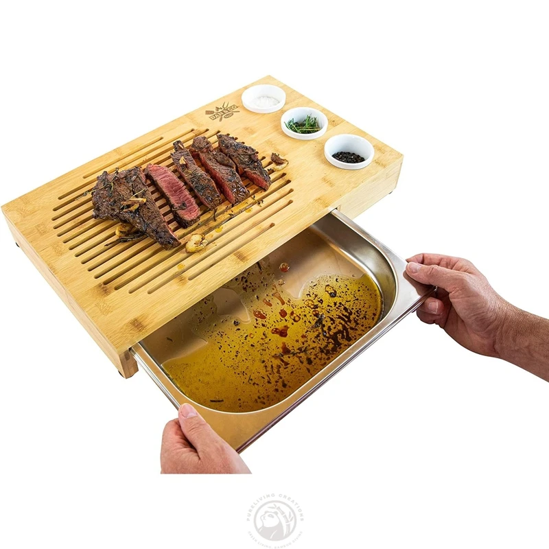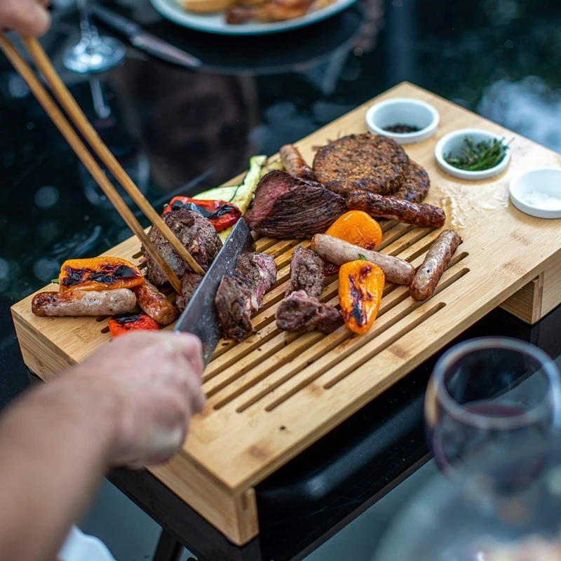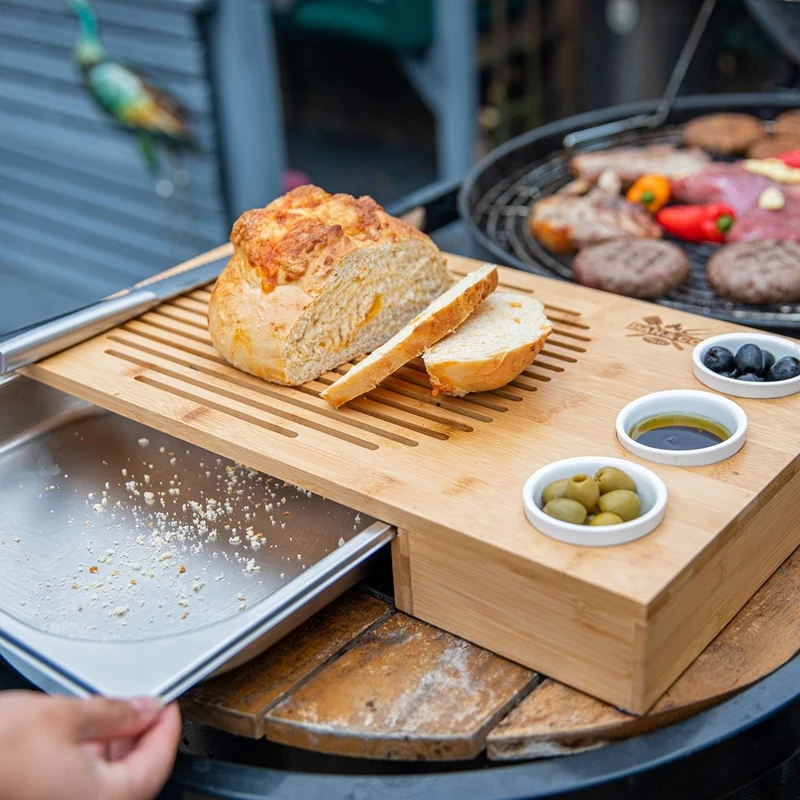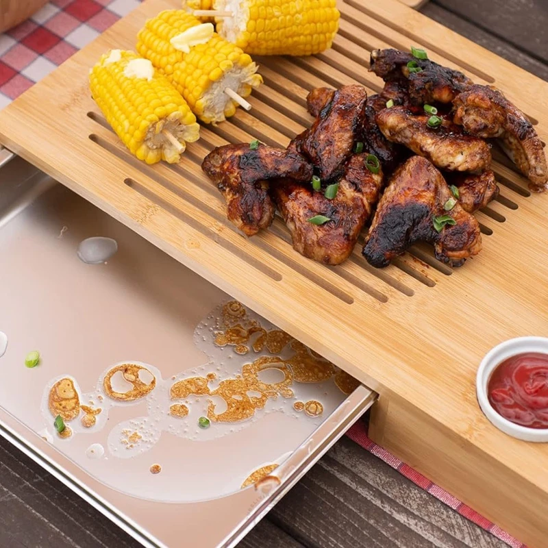 Multifunctional Bamboo Wood Cutting Board With Sliding Steel Drip Tray for Barbecue Wooden Cheese Board Set