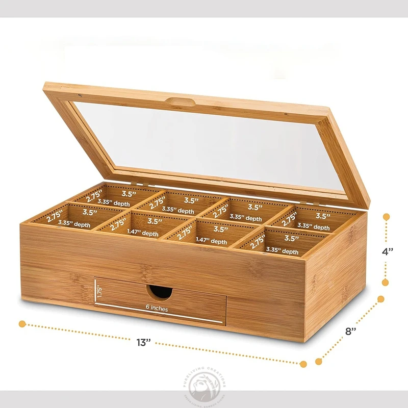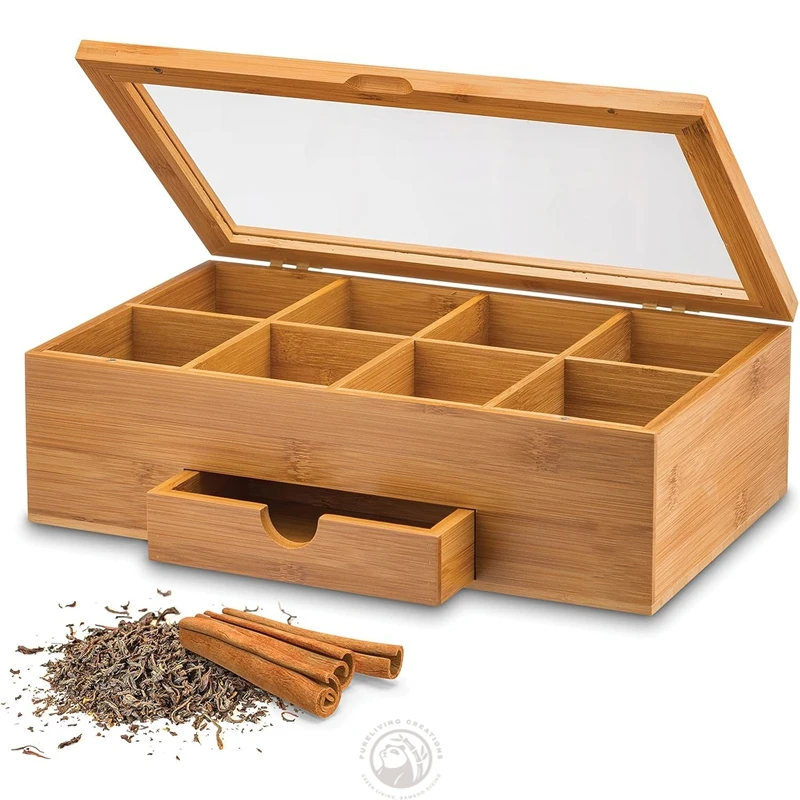 Customized Clear Lid Window Bamboo Organizer Tea Box Compartments Storage Drawer Bamboo Tea Gift Box