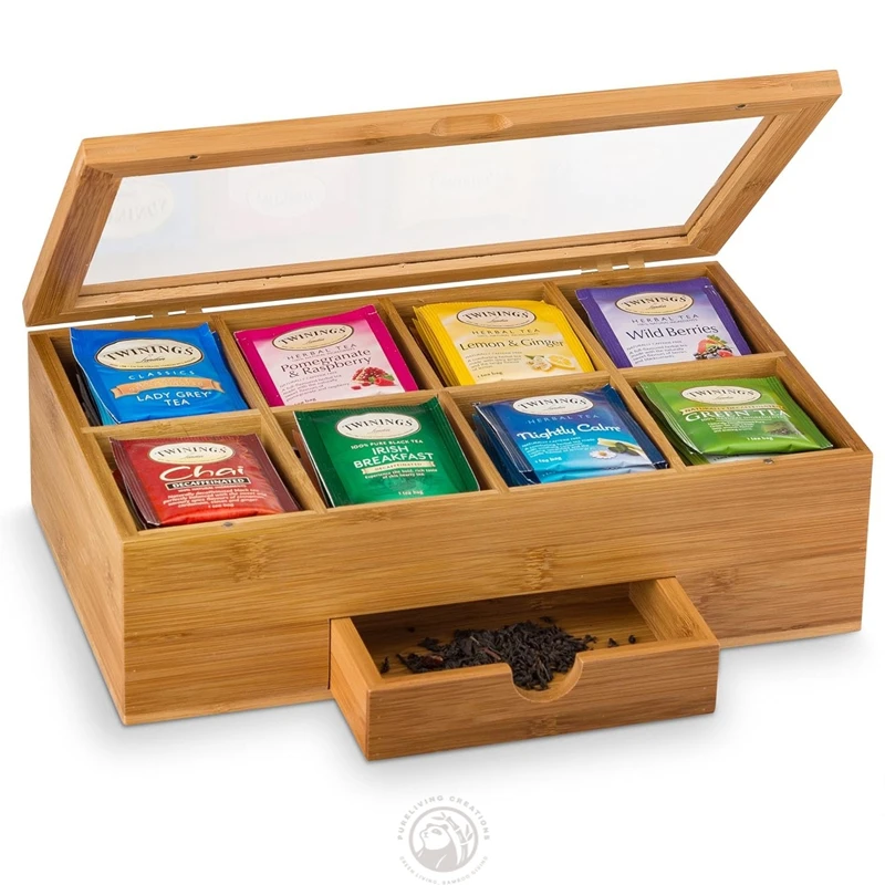 8 Compartments with Drawer Storage Bamboo Wooden Tea Bag Holder Box