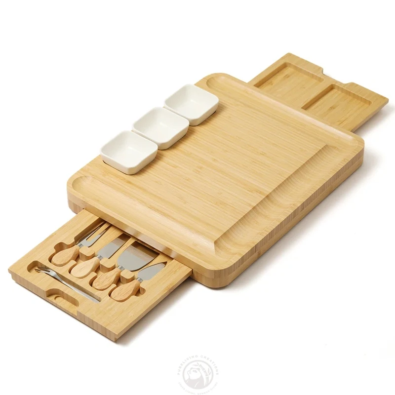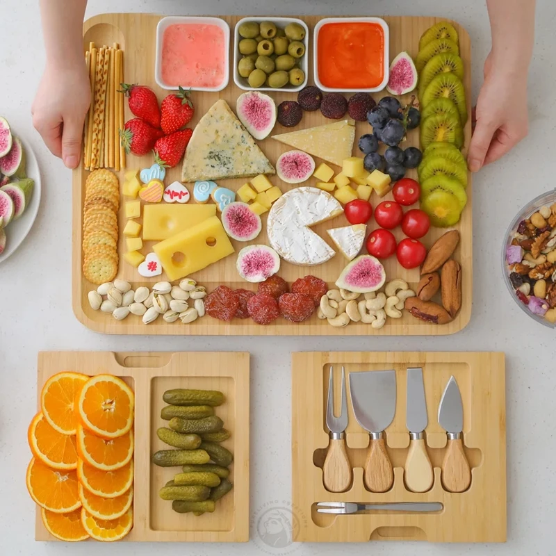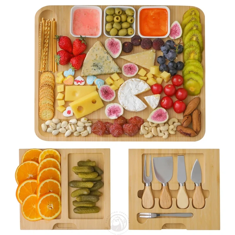 Kitchen Bamboo Cheese Board with Drawer Cheese Slate 4 Stainless Steel Knives Cracker Platter Cheese Cutting Board Sets