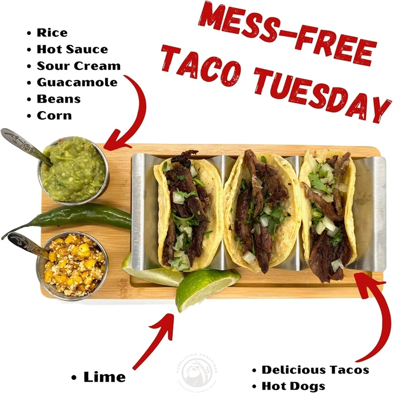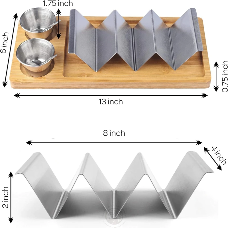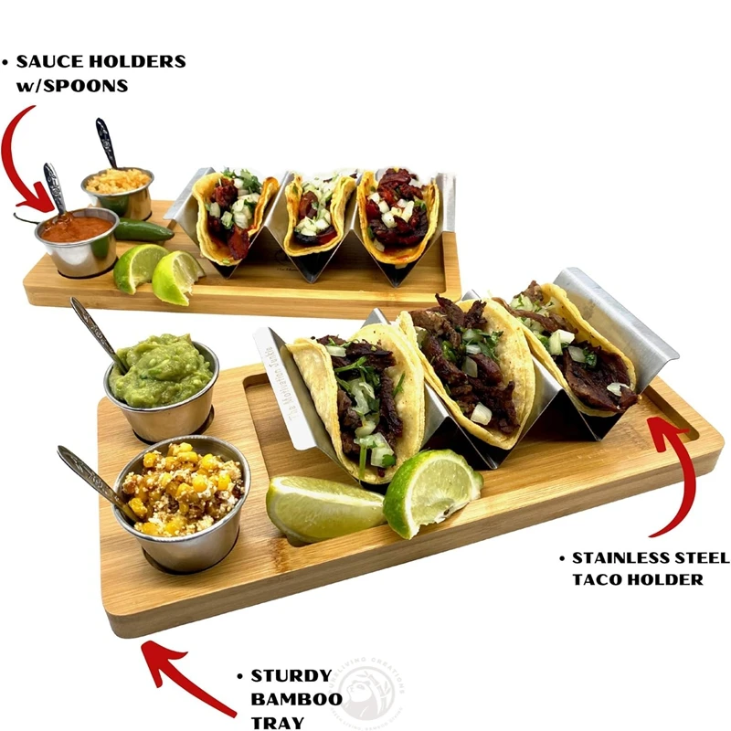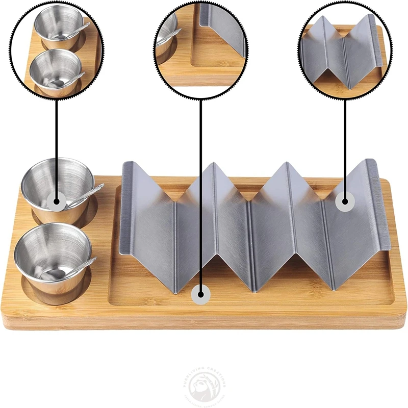 Bamboo and Stainless Steel 3-in-1 Taco Holder Kit Set including Taco Shell Stand Serving Tray Sauce Cup