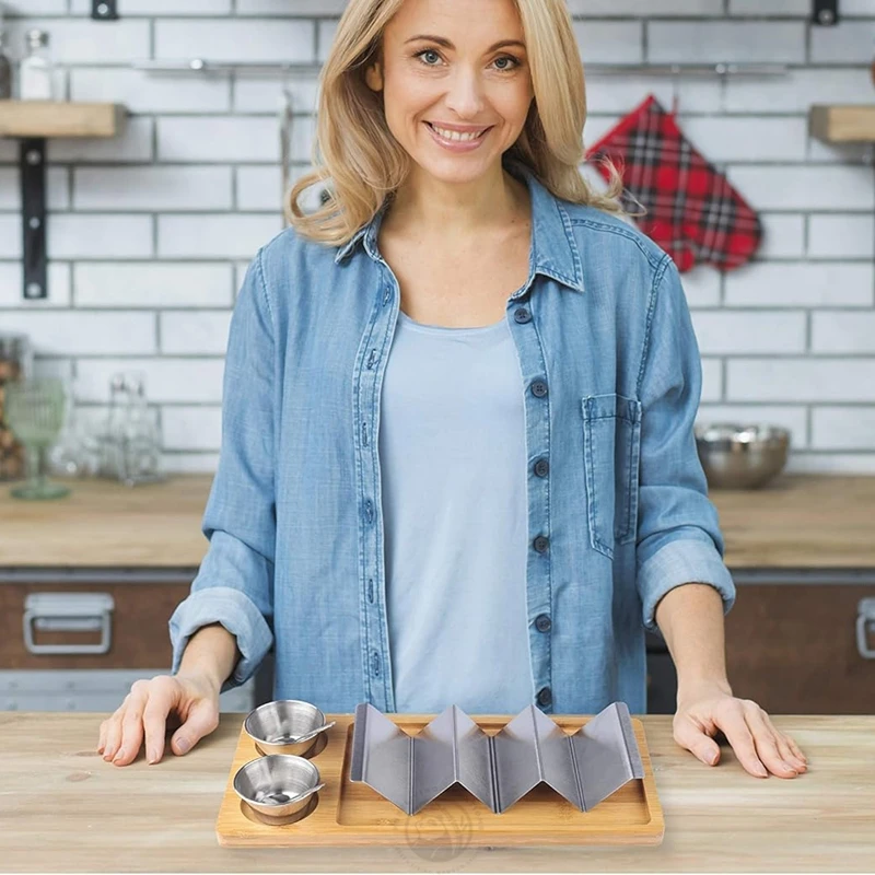 Kitchen Accessories Wooden Tray Board Stainless Steel Taco Holder Stand With Sauce Holder And Spoons