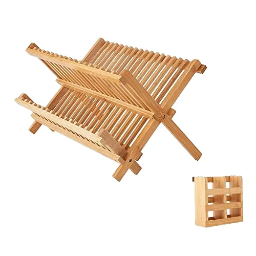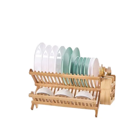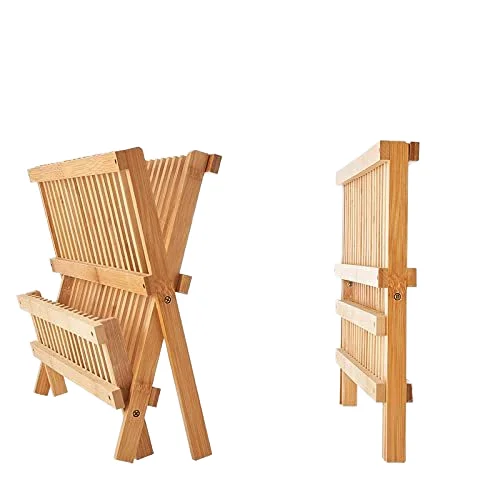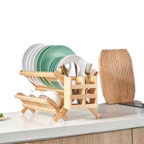 Bamboo Folding 2-Tier Collapsible Drainer Dish Drying Rack with Utensils Flatware Holder Set Dish Rack
