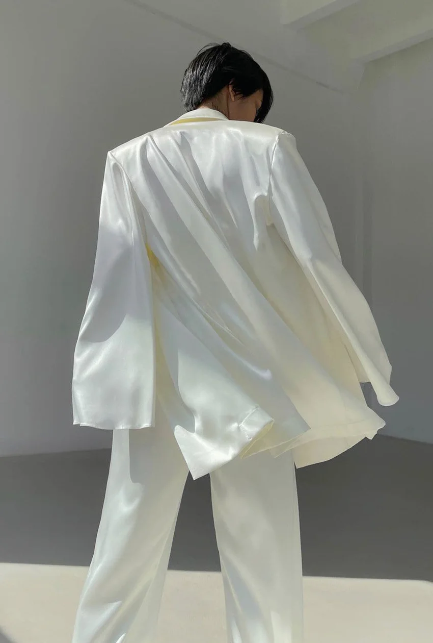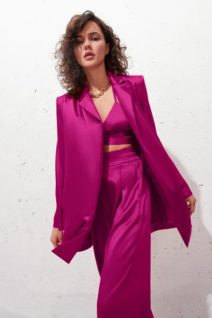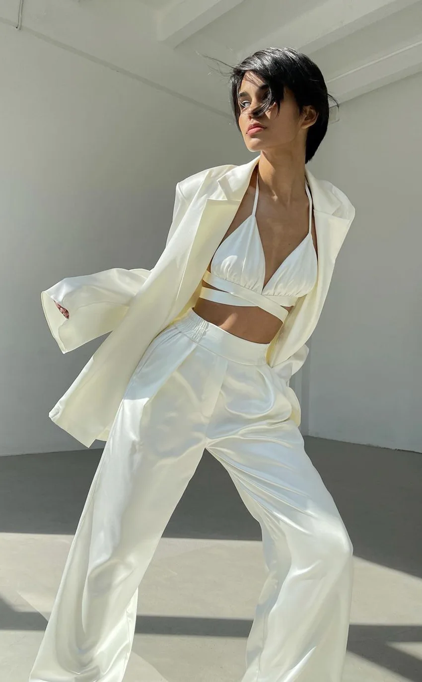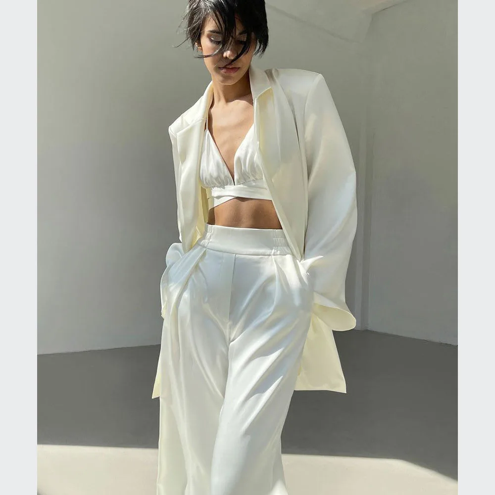 2022 Spring Womens Clothing Two Piece Pants Set Satin Crop Top Fashion 3 Pieces Blazer Womens Sets