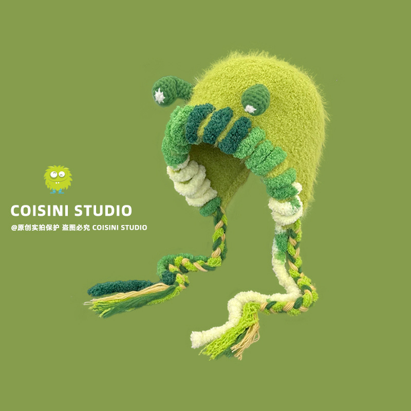 japanese style funny cute little monster plush sleeve cap women's autumn and winter thickened warm riding knitted earmuffs hat