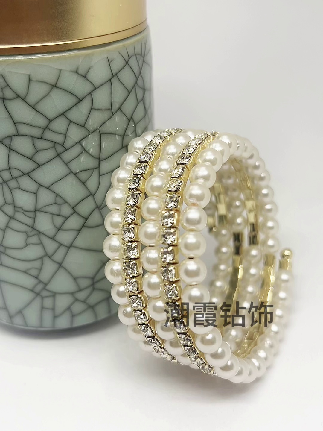 Trendy Diamond-Studded Crystal Bracelet with Multiple Layers, Pearl and Rhinestone Wrapped Open-Faced Bracelet, and Diamond-Embellished Bracelet for Women