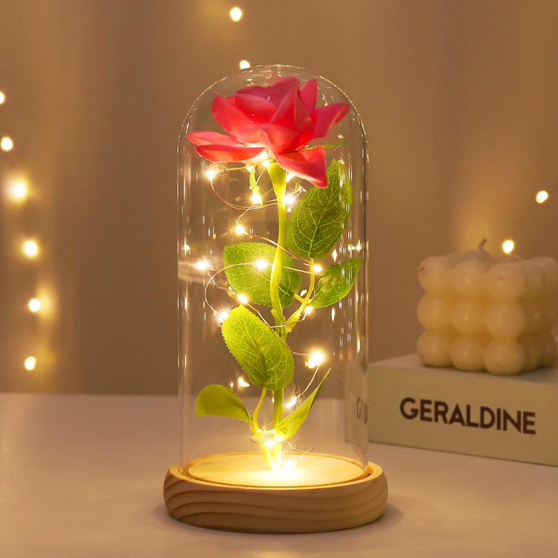 red rose + log base + glass cover + warm lamp