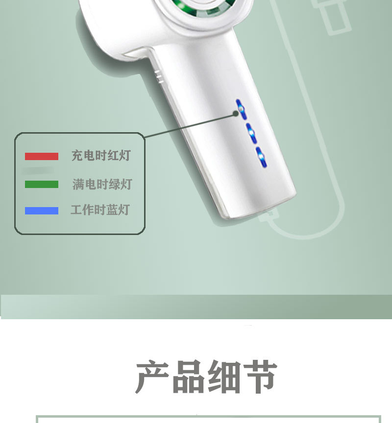 Charging red light, full charge green light, working blue light Charging time: 2 hours Usage time: 1 hour Lithium battery 14500 RPM: 8500