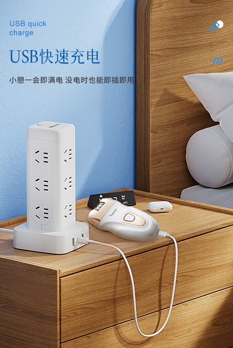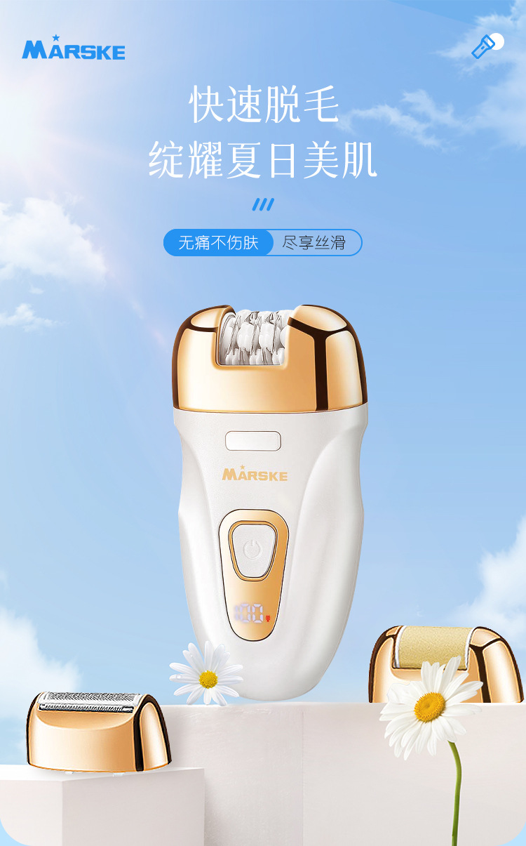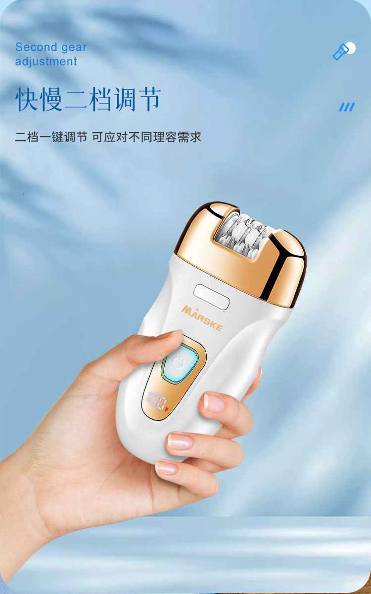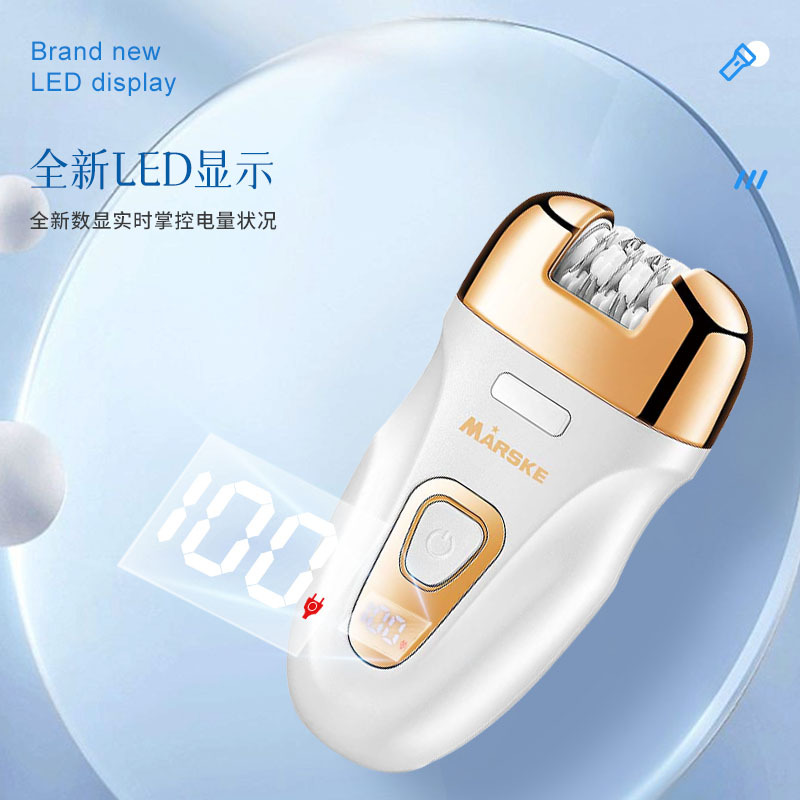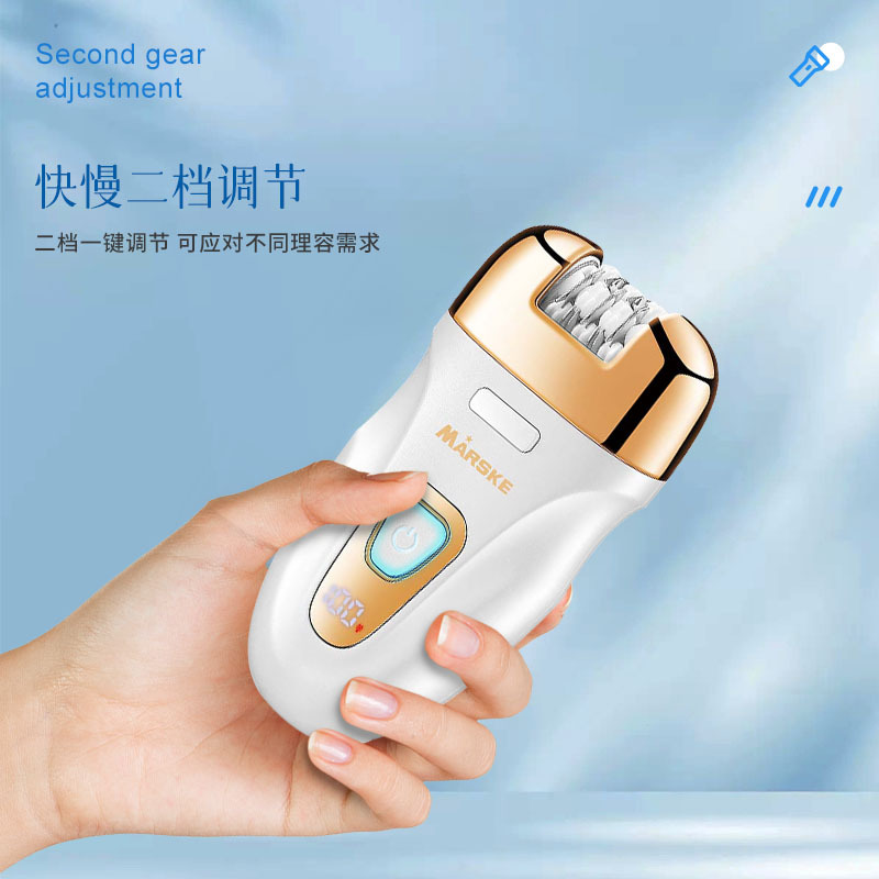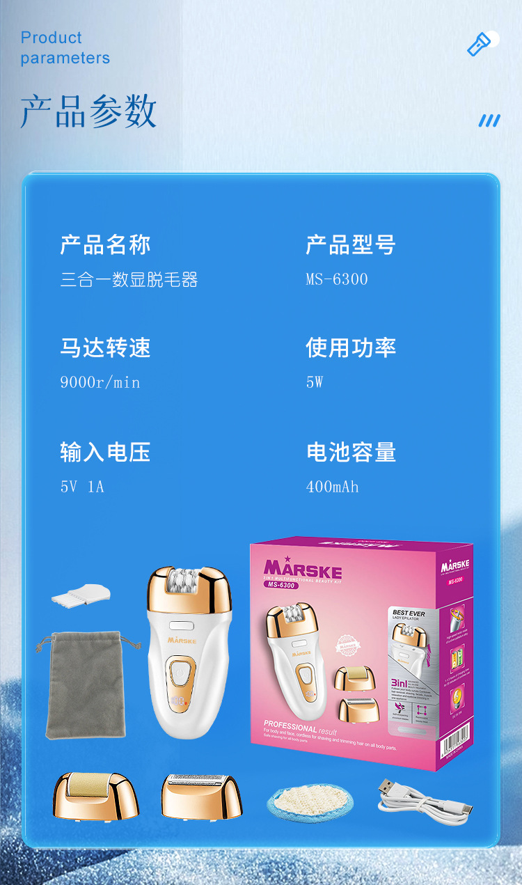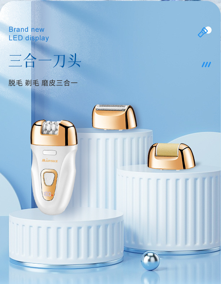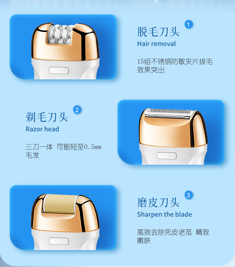 Set includes: hair removal device main body, shaving head, abrasive head, cleaning cloth, cleaning brush, storage bag, charging cable, English instruction manual.