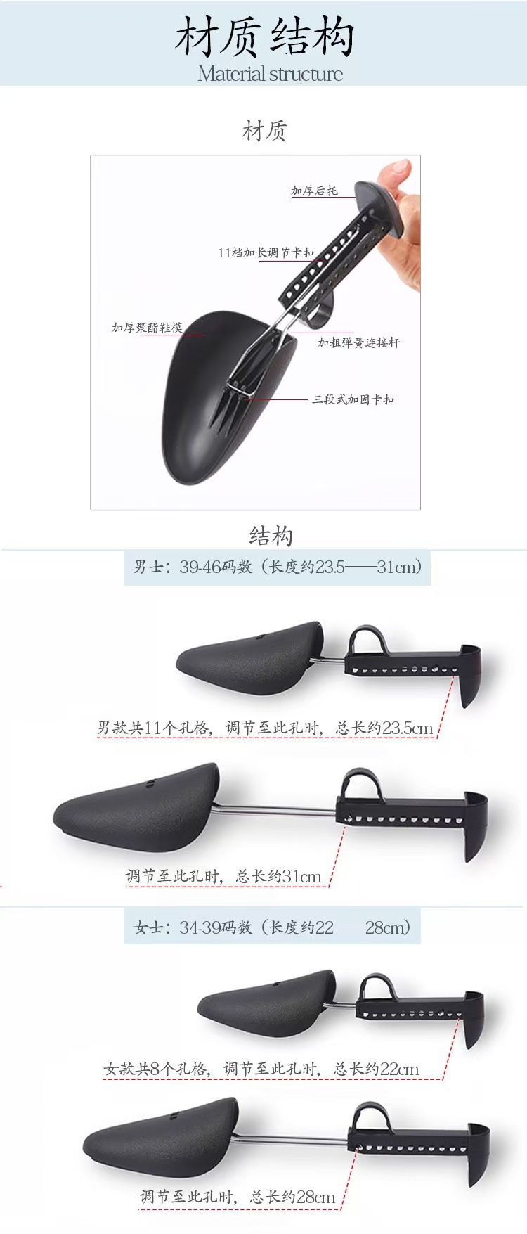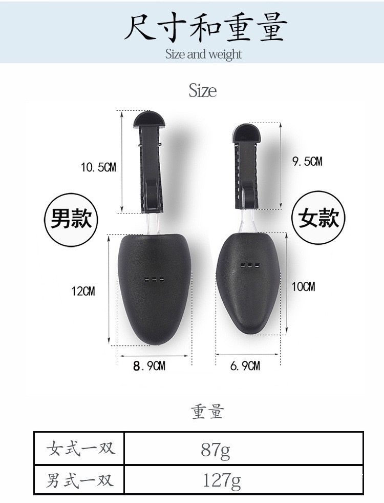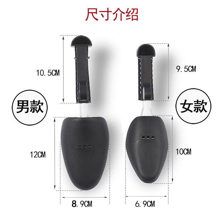 Usage: Shoe shaping and protection. For soft leather shoes with slightly tight toe, this shoe support can be adjusted to fit different sizes, suitable for various types of shoes. This shoe support uses the adjustment of front-to-back length to tightly hold the front of the shoe cavity and the back of the shoe, maintaining a constant support force. It supports the shoe sole and upper, extending the service life of the shoes! Material: Durable plastic PP + strong and tough metal wire.