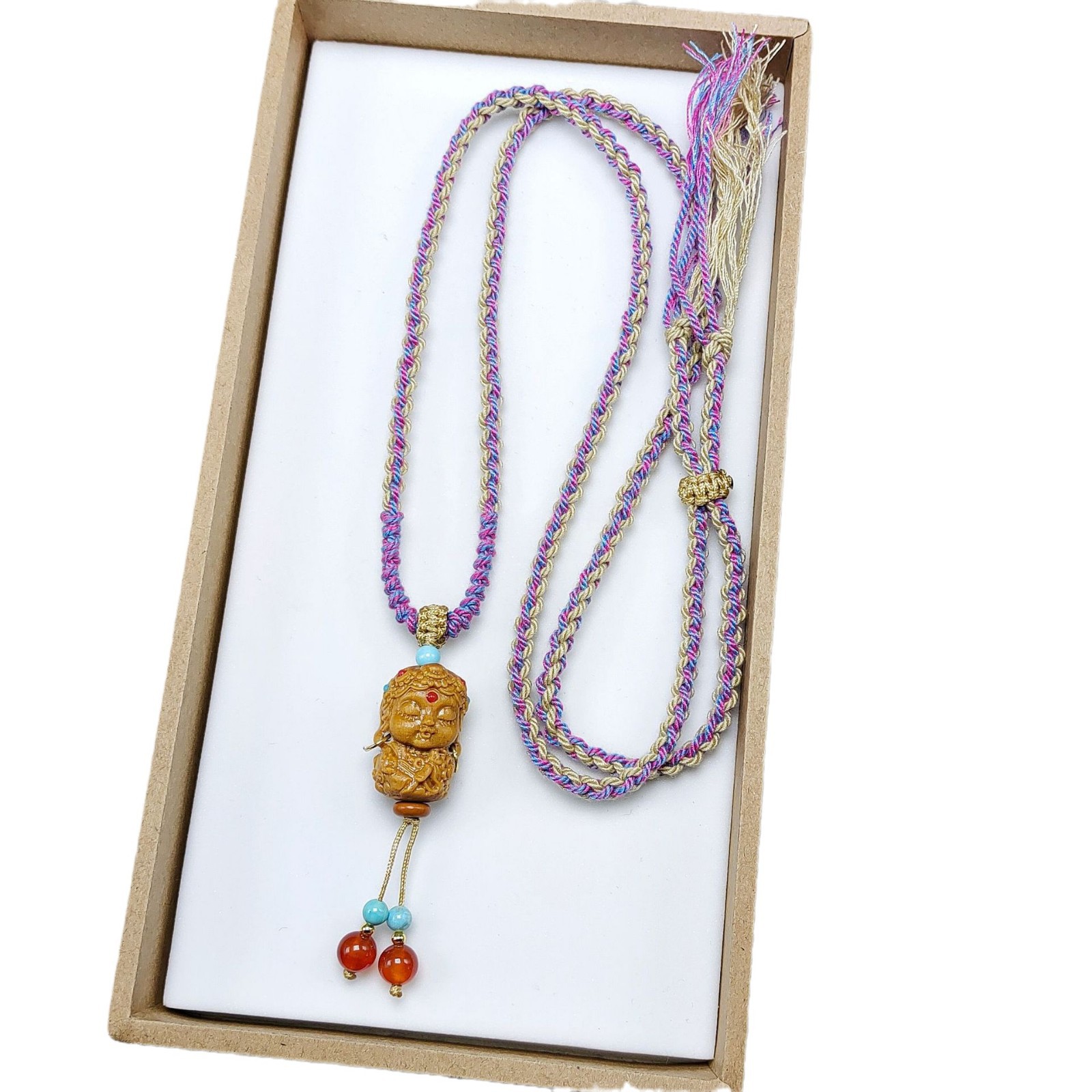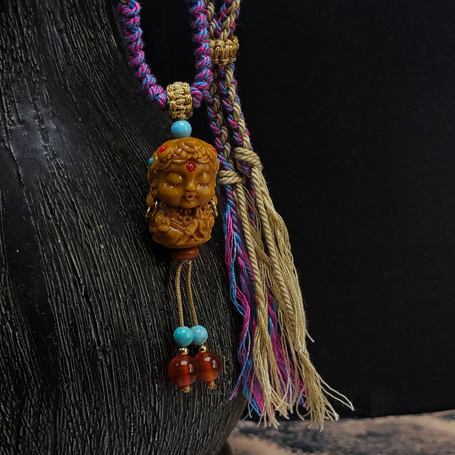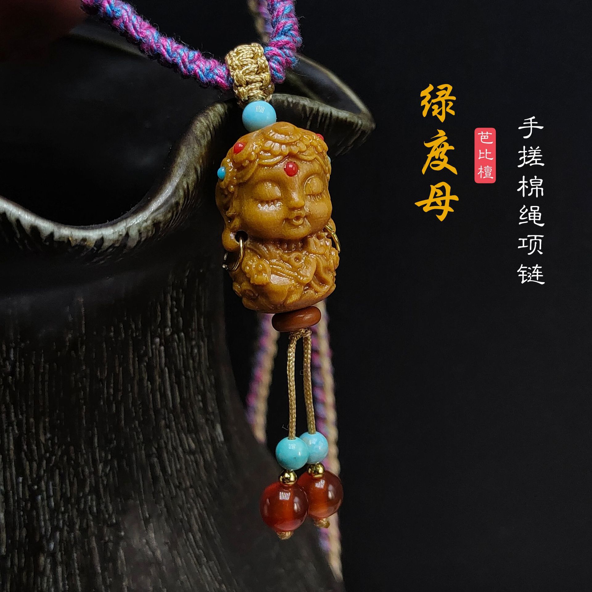 材质:檀木、红玛瑙、优化绿松石、手搓棉线