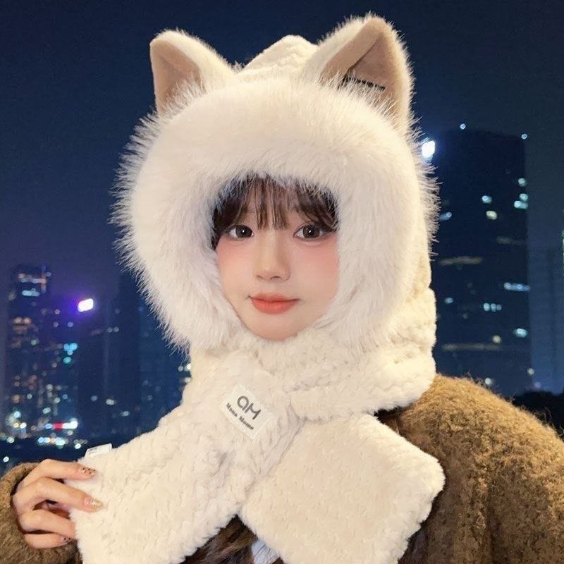 new fox fur plush hat scarf integrated women's autumn and winter girls' cute cycling scarf thermal and windproof 中文版